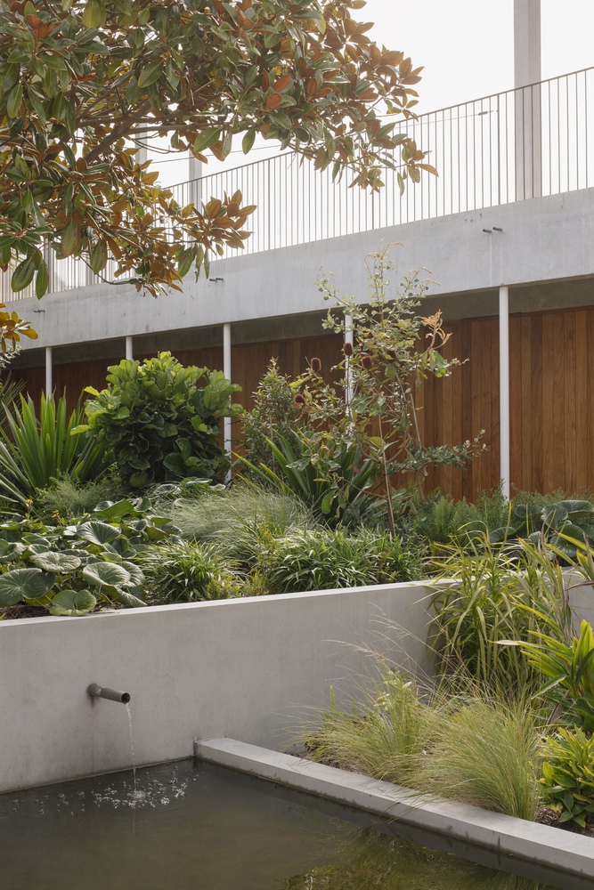 The middle level, featuring an open-air promenade and pool, centres around the dryness and the canopy.