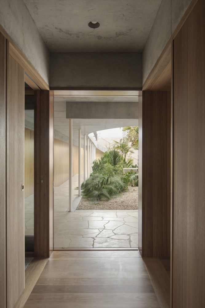 The ground floor, with its enveloping loggia and three-story courtyards, engages in a wet and shaded dialogue.