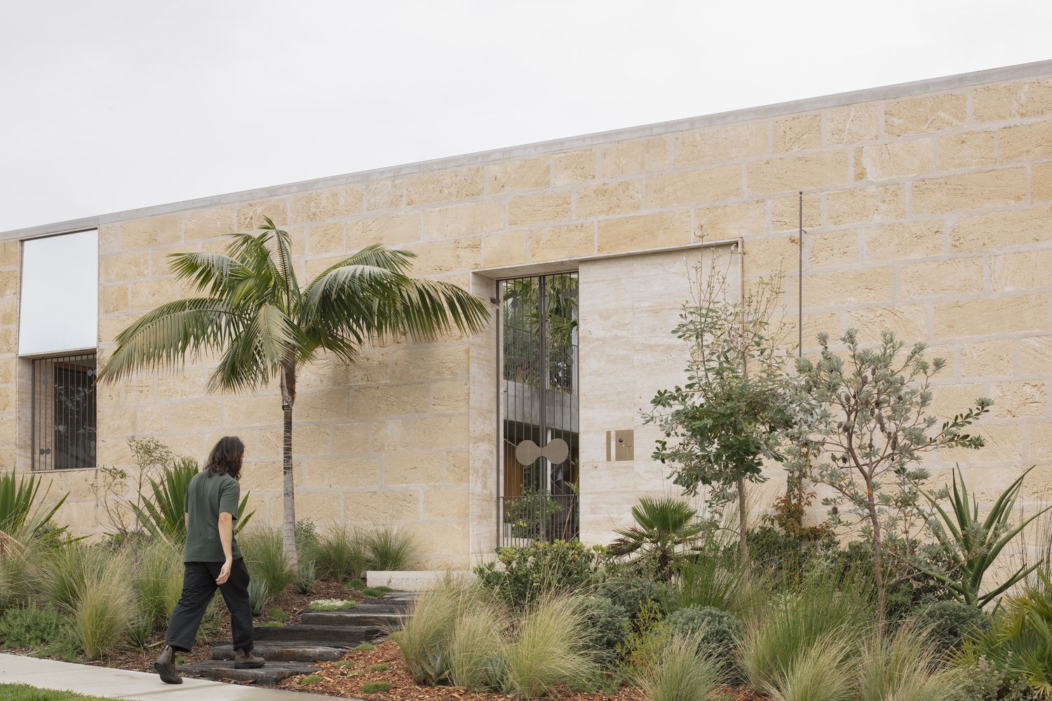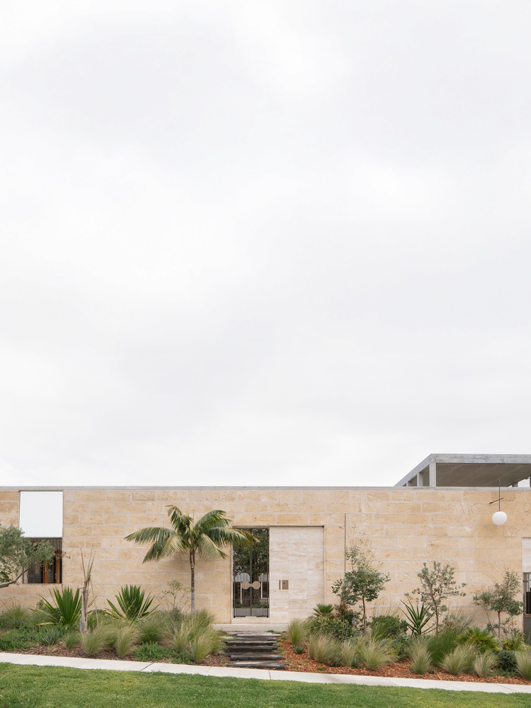 A thick limestone wall begins at one corner at hip height and rises to nearly two stories at the opposite corner, with only a few thoughtfully placed openings offering intriguing glimpses of what lies within, which include a cluster of Cabbage tree palms and a mature evergreen Magnolia Grandiflora.