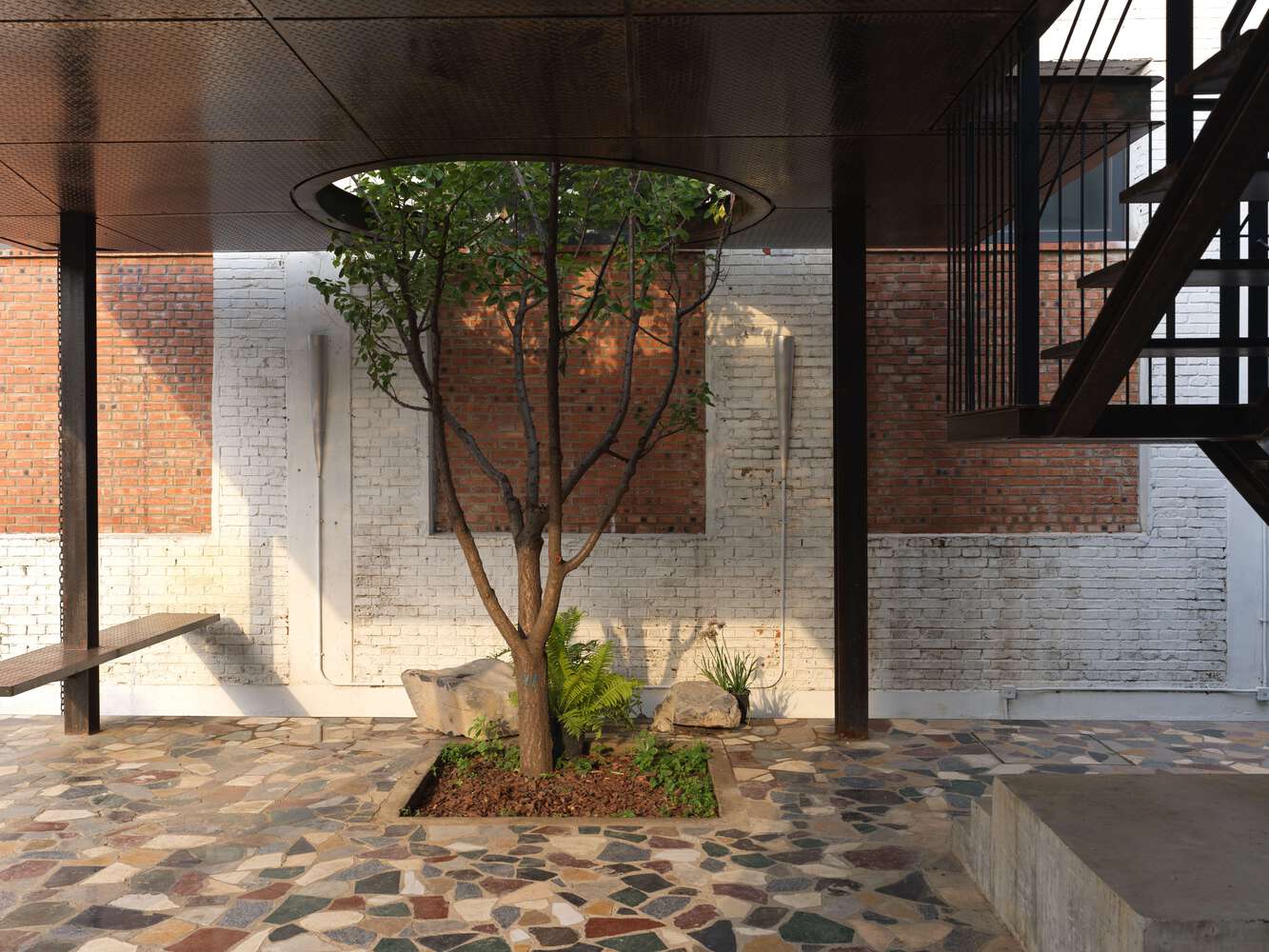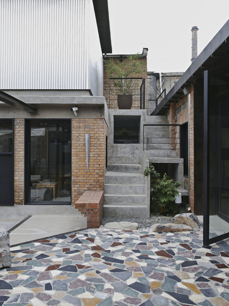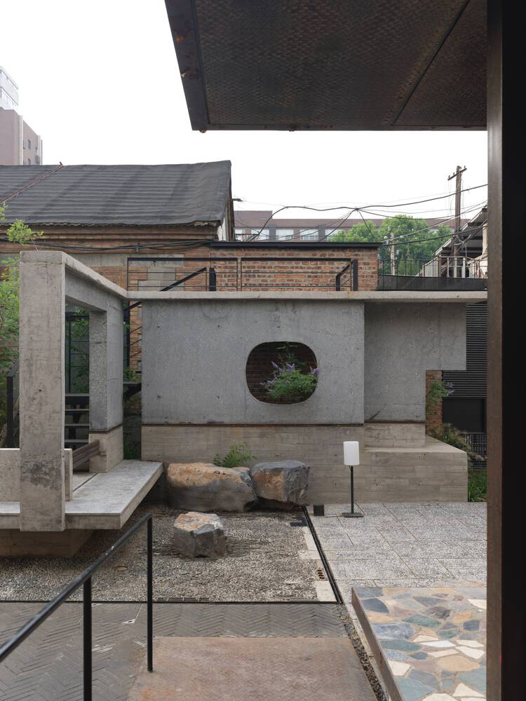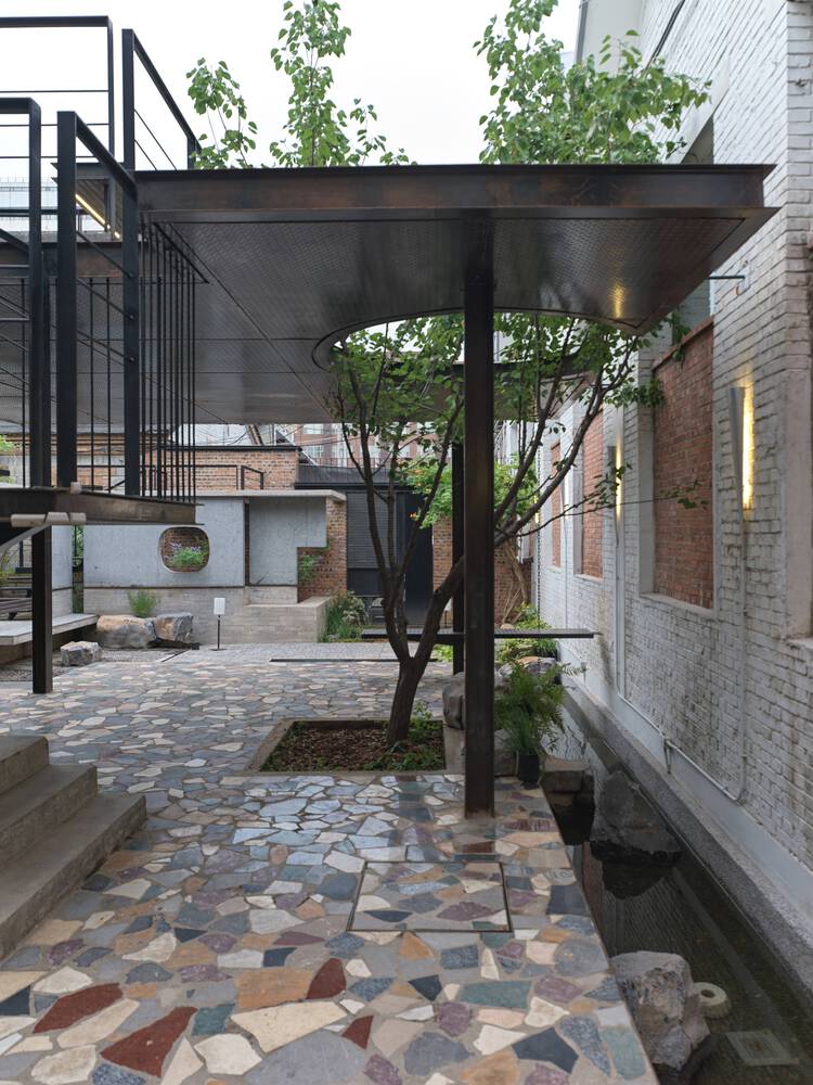 The courtyard's layered composition mirrors the chaotic vitality of urban environments, transforming disorder into a curated spatial experience.