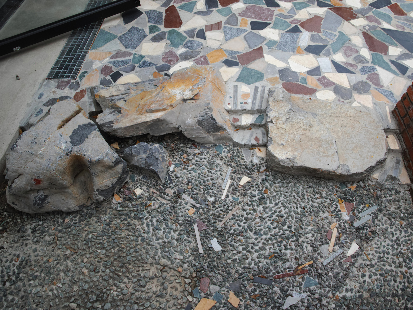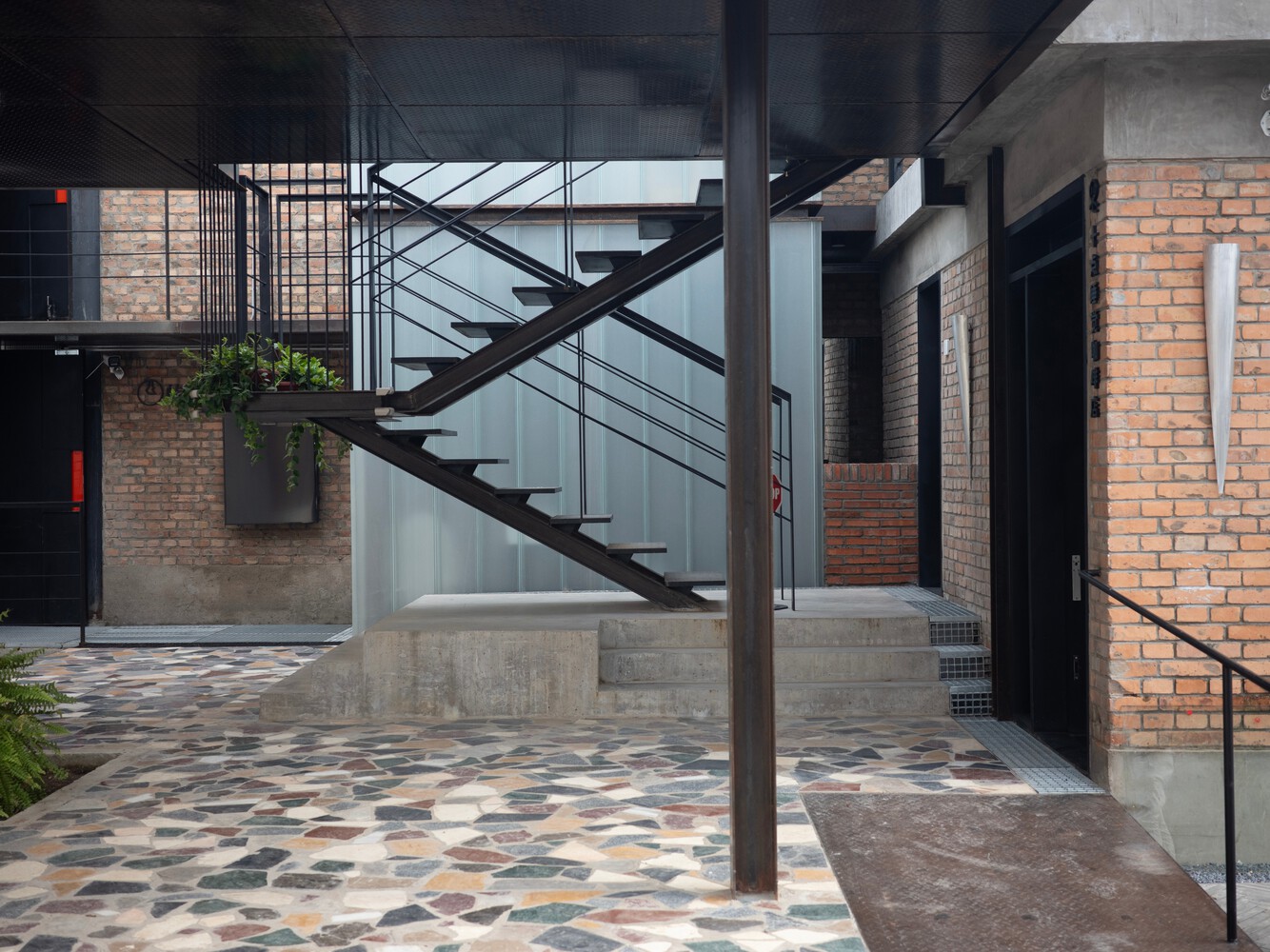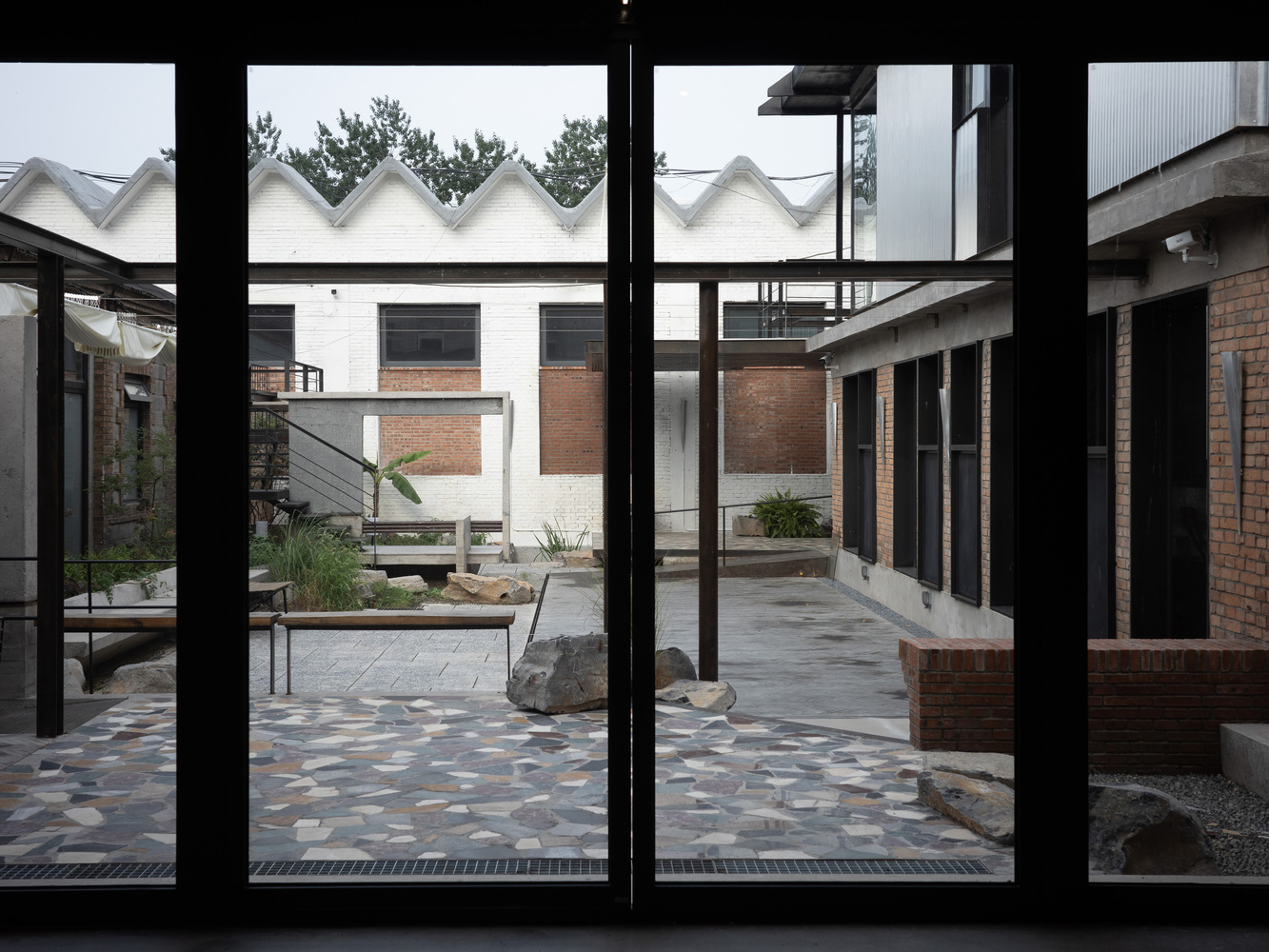 The courtyard's layered composition mirrors the chaotic vitality of urban environments, transforming disorder into a curated spatial experience.