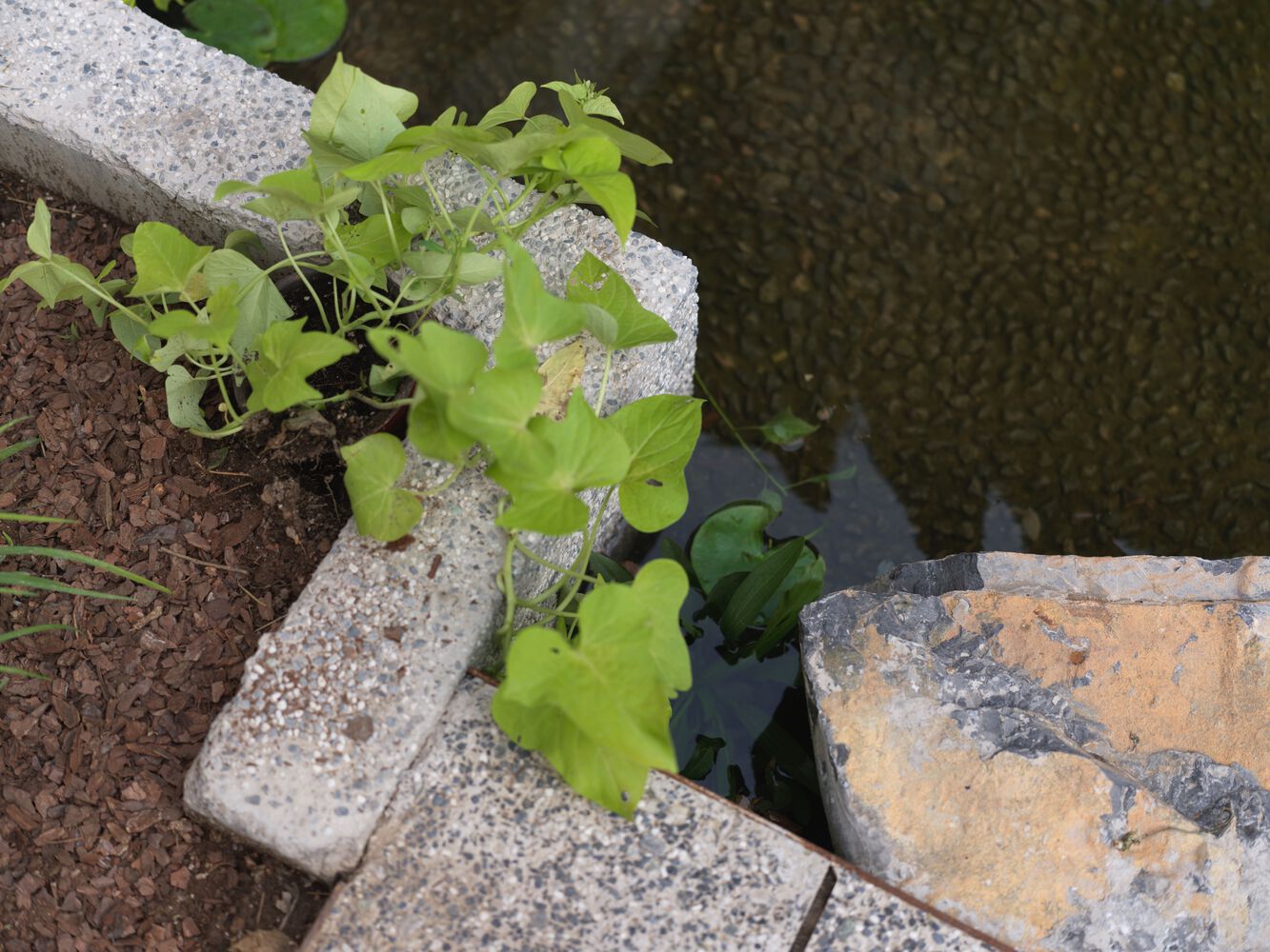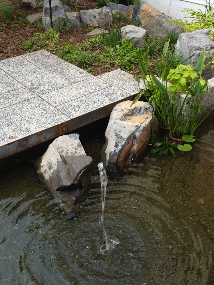 The water feature, with its stone edging transitioning into crushed gravel, adds an auditory dimension to the spatial experience, fostering a balanced sensory environment.