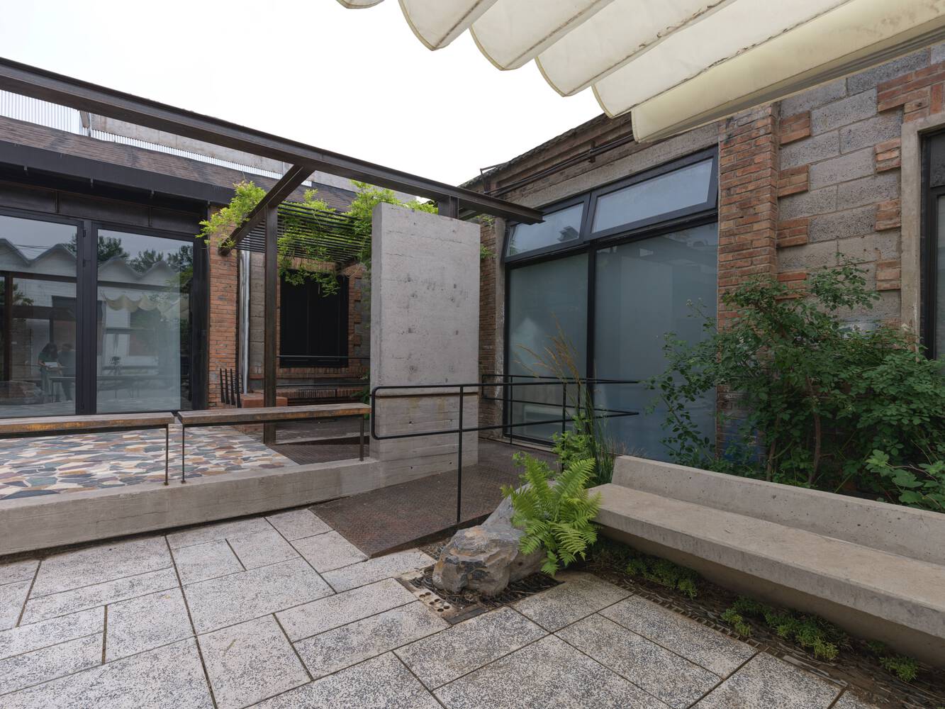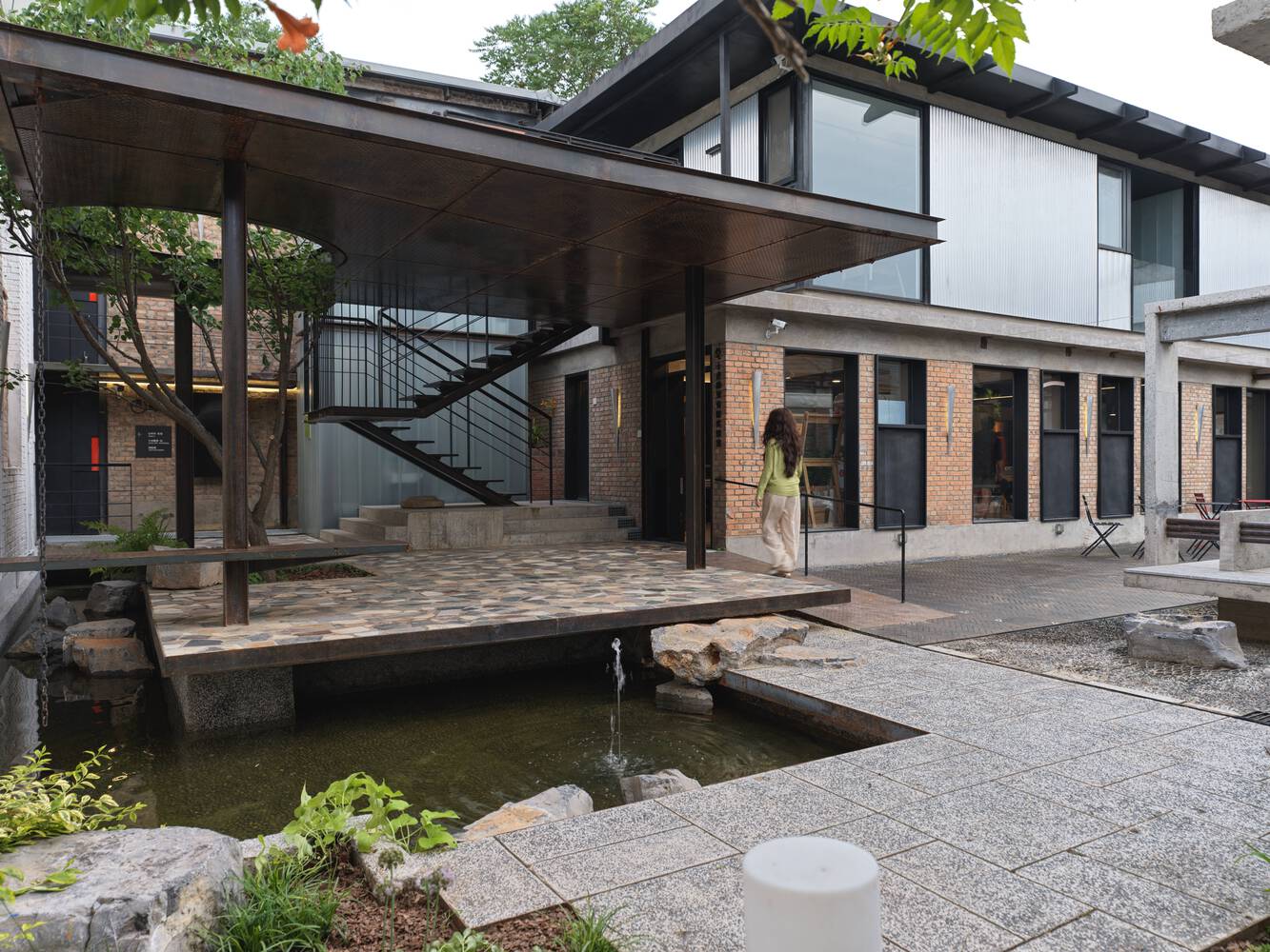 The spatial sequence unfolds through a series of carefully calibrated transitions: a double-layer aluminum walkway mediates between phases, while the L-shaped concrete "stone screen" anchors the courtyard as both physical and visual focal point.