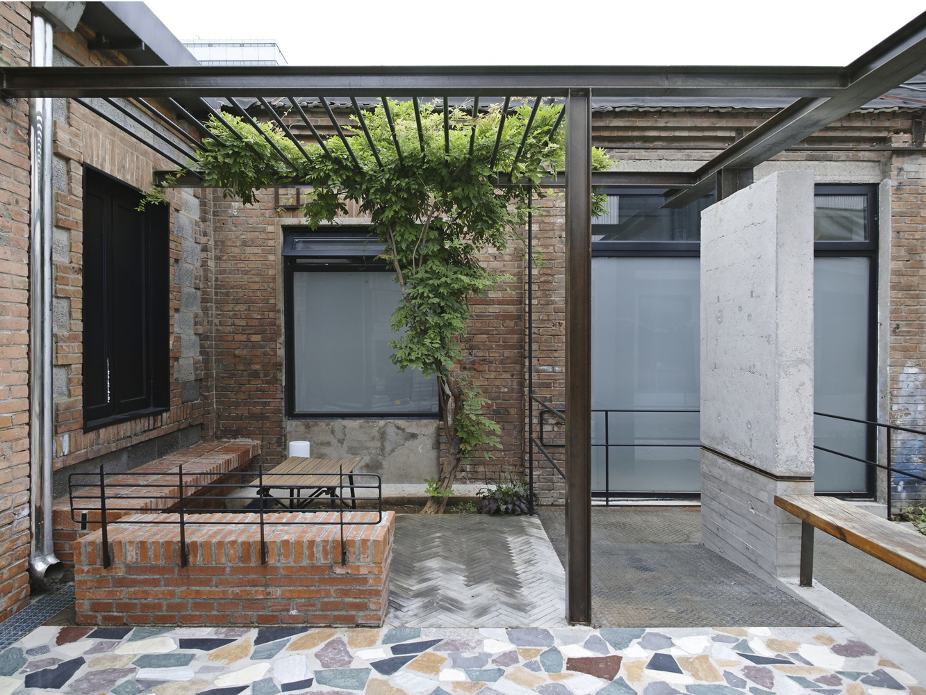 Nestled between existing structures, the courtyard navigates spatial constraints through strategic interventions.