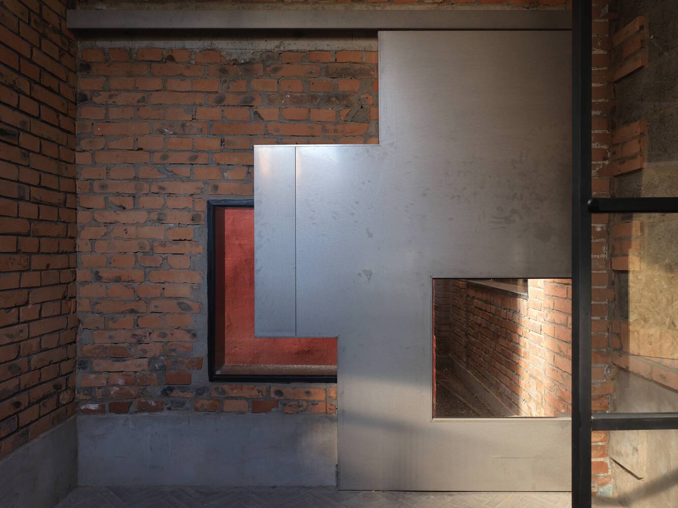 A steel pavilion erected at the southeast corner serves as a connective tissue between exhibition spaces, café, and courtyard, integrating functional elements like an outdoor restroom and vertical circulation.