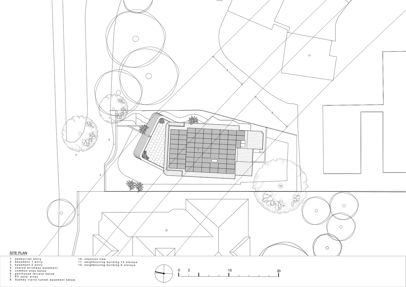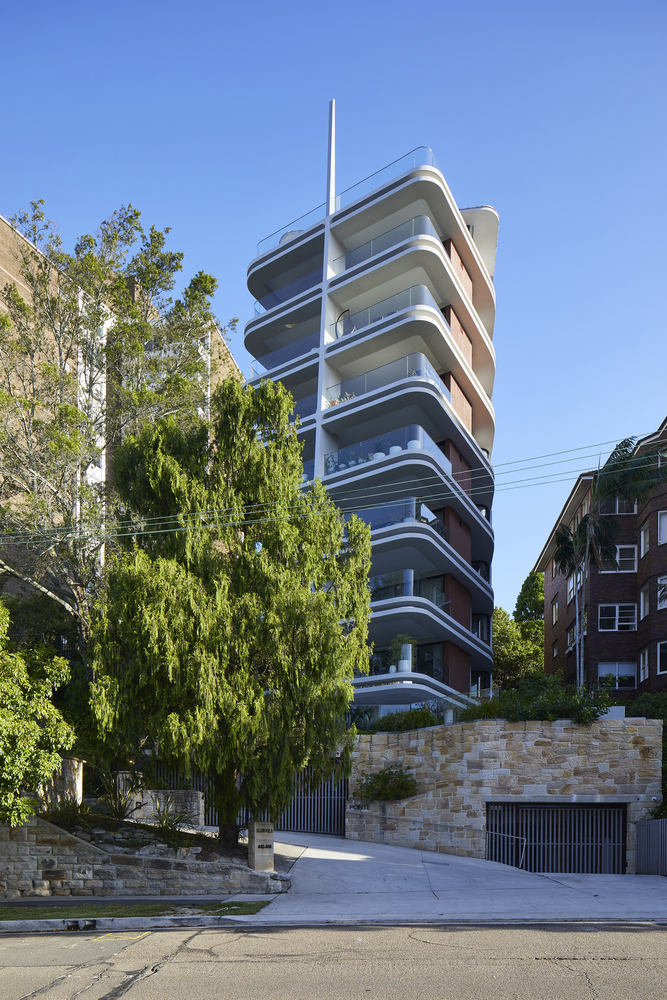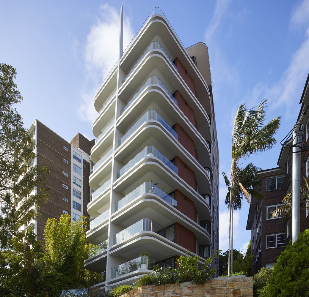 Its form, appearing as a central spine with a ribcage of concrete beams radiating outwards from it, provides an eye-catching street presence that tapers and twists away from the adjoining buildings, ensuring privacy and maximum solar access to each of the ten apartments' north facing balcony 'ribs'.