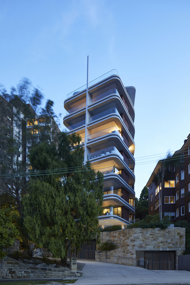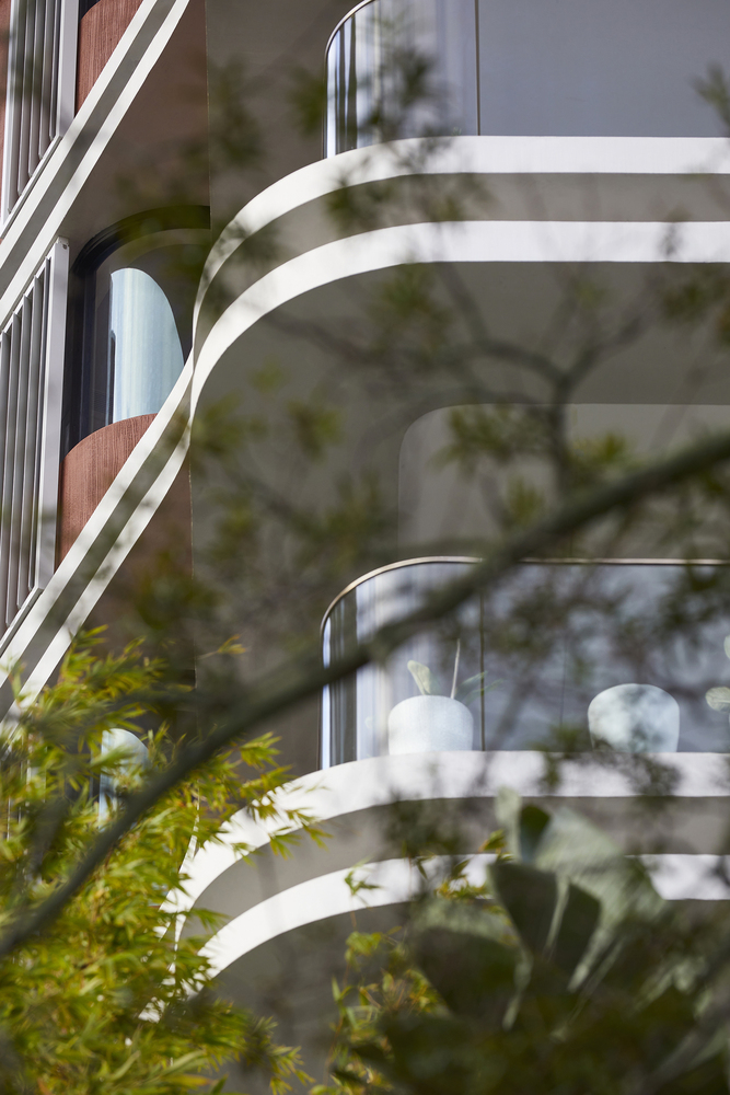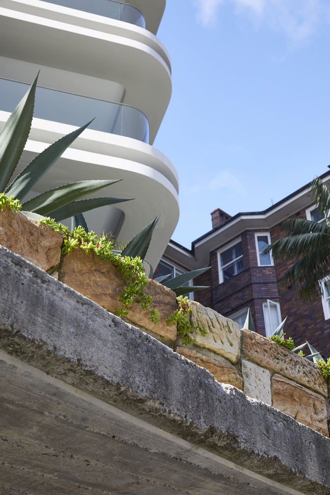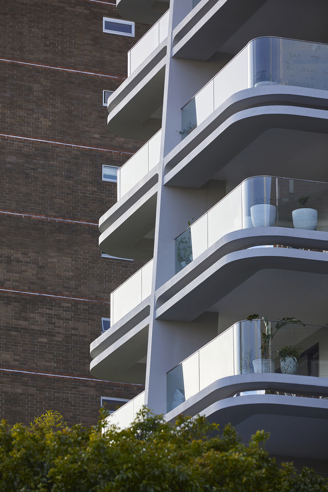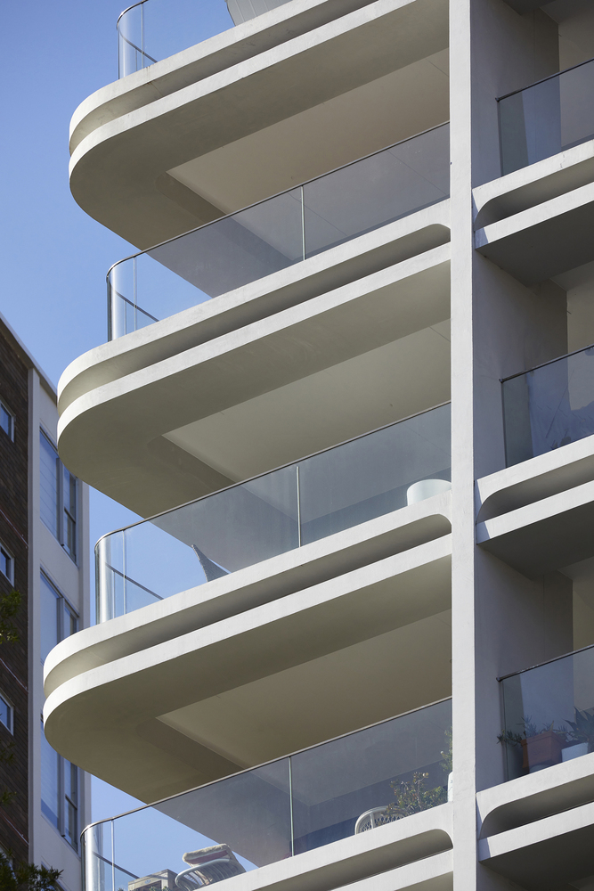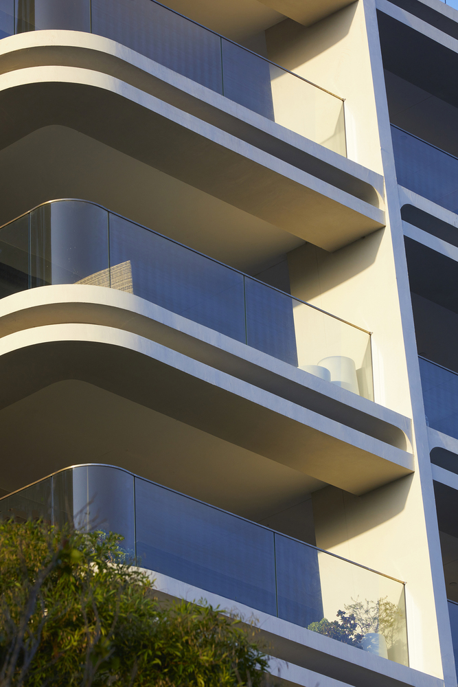 Elements such as rough combed finish rendered walls, stylized exposed off form concrete ceilings, curved glass balustrades and double edge concrete beams with mirrored inserts contribute to a development with a level of detail reminiscent of the interwar apartment buildings that characterize the locality.