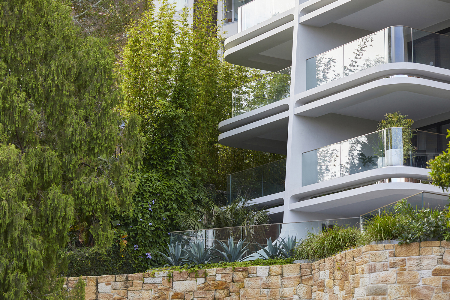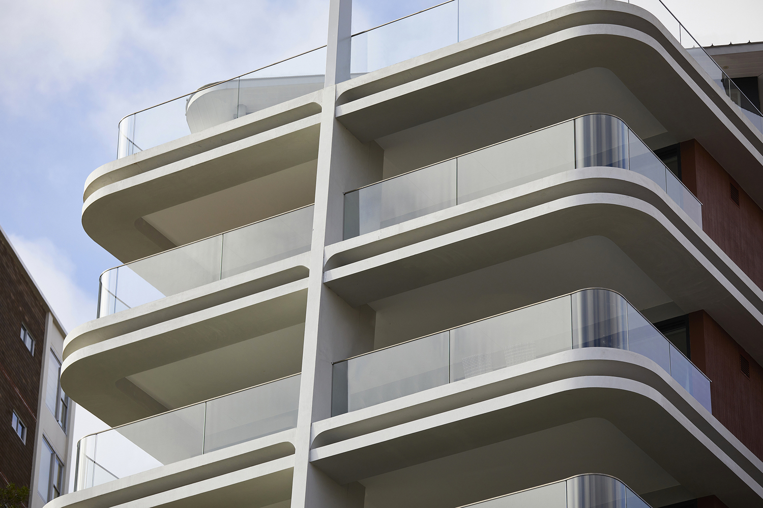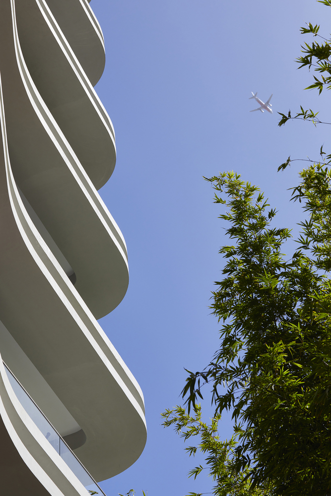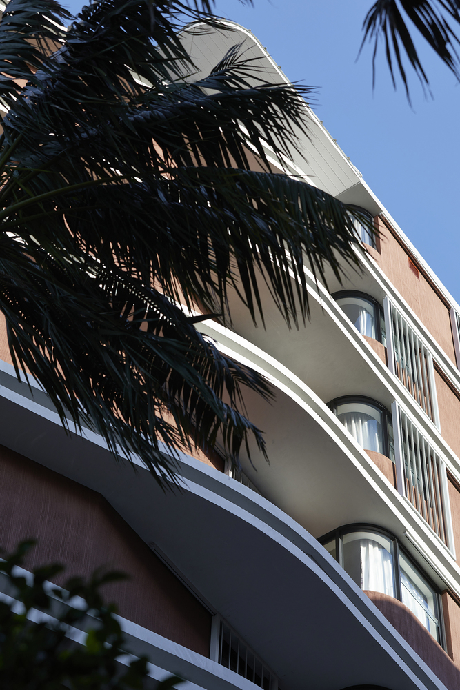 Elements such as rough combed finish rendered walls, stylized exposed off form concrete ceilings, curved glass balustrades and double edge concrete beams with mirrored inserts contribute to a development with a level of detail reminiscent of the interwar apartment buildings that characterize the locality.