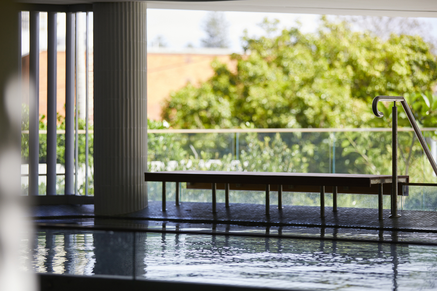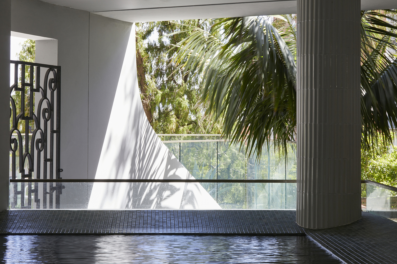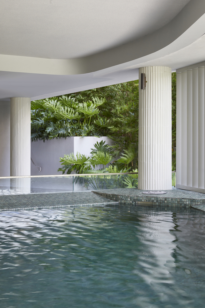 Both the apartments and the pool area are oriented northwards to give much access as possible to natural light for the living spaces during the winter months, while large covered balconies and louvered windows protect the building from the harsh sun during the summer.