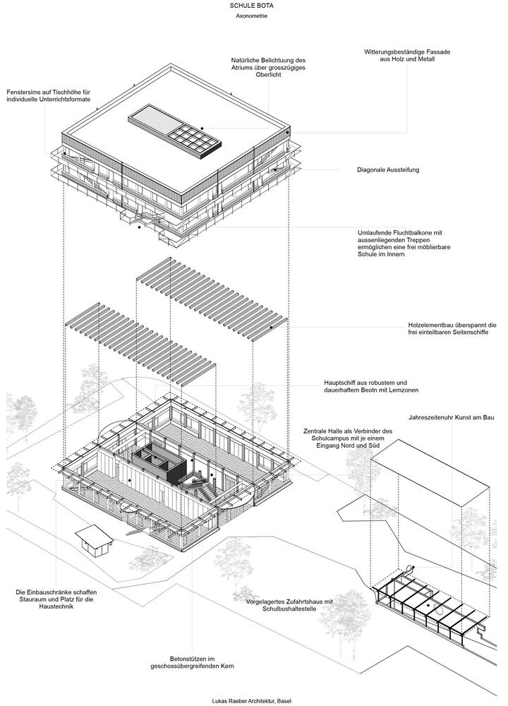 The two laterally arranged "side naves," constructed using sustainable timber elements, form the flexible layer of functional spaces that house the classrooms.
