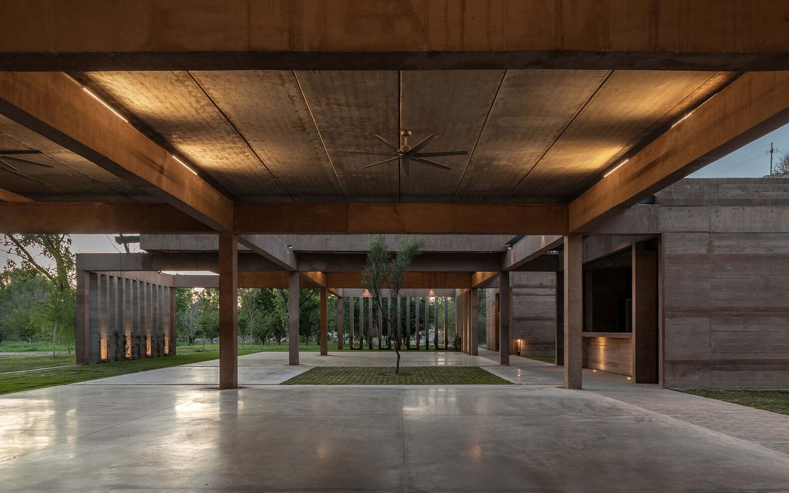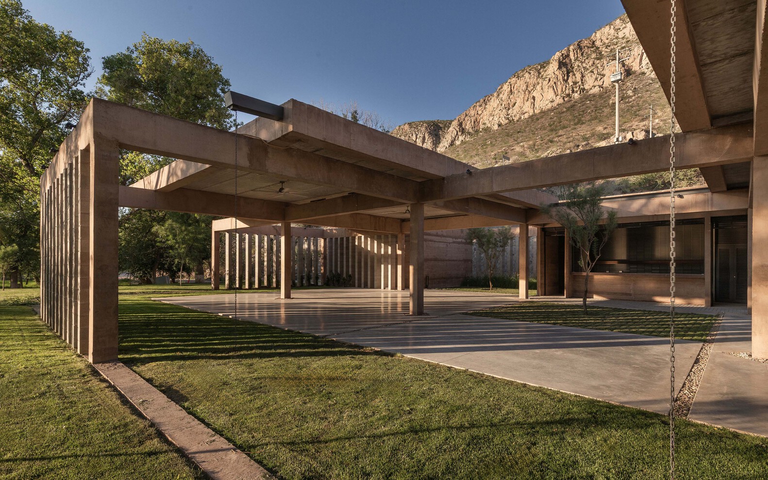 It is organized around a grid of concrete frames that support the roofs and create a sequence of patios and shaded spaces, where movement, light, air, and vegetation become the main features and invite users to relax from the everyday routine.