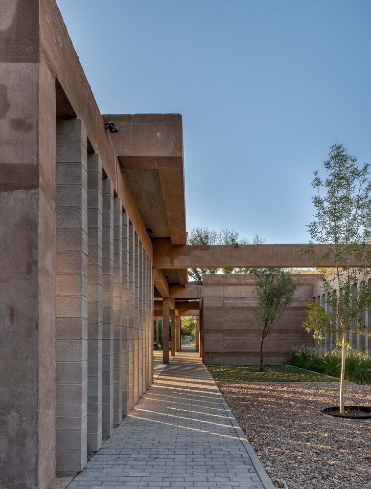 The raw material in various formats is concrete. The structural elements made on-site were pigmented in earthy tones, while prefabricated elements such as blocks, cobblestones, and the hollow core slab system were worked in natural colors, aiming to create a cozy and timeless place that blends with the landscape.