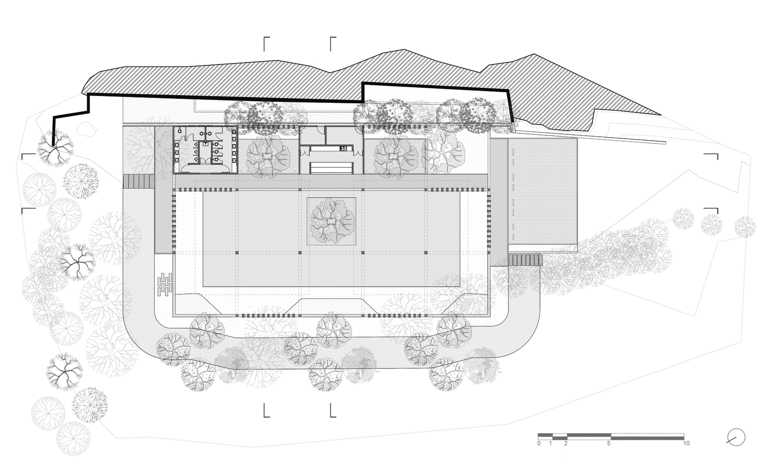 The pavilion sits at the foot of the hill, next to an existing masonry wall, among large trees and on a raised embankment designed to level and elevate the views towards the surroundings.