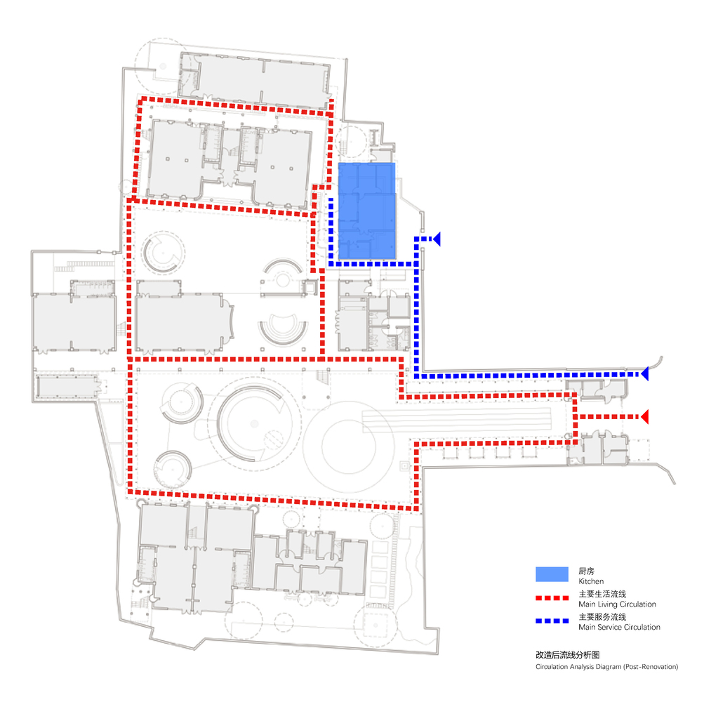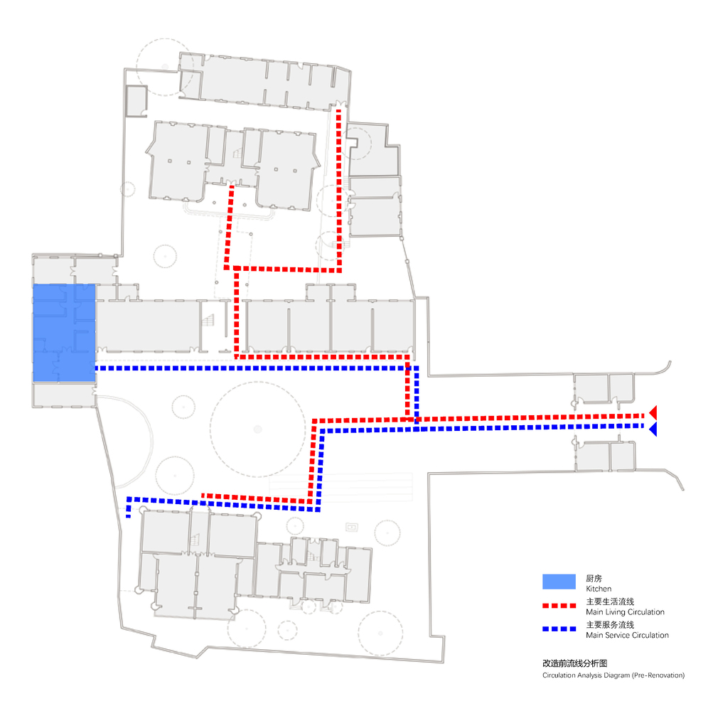 Consequently, delivery vehicles and staff bicycles all had to travel the full east–west span of the grounds, entangling service and circulation flows and creating persistent confusion.