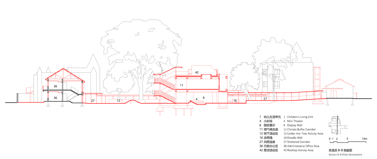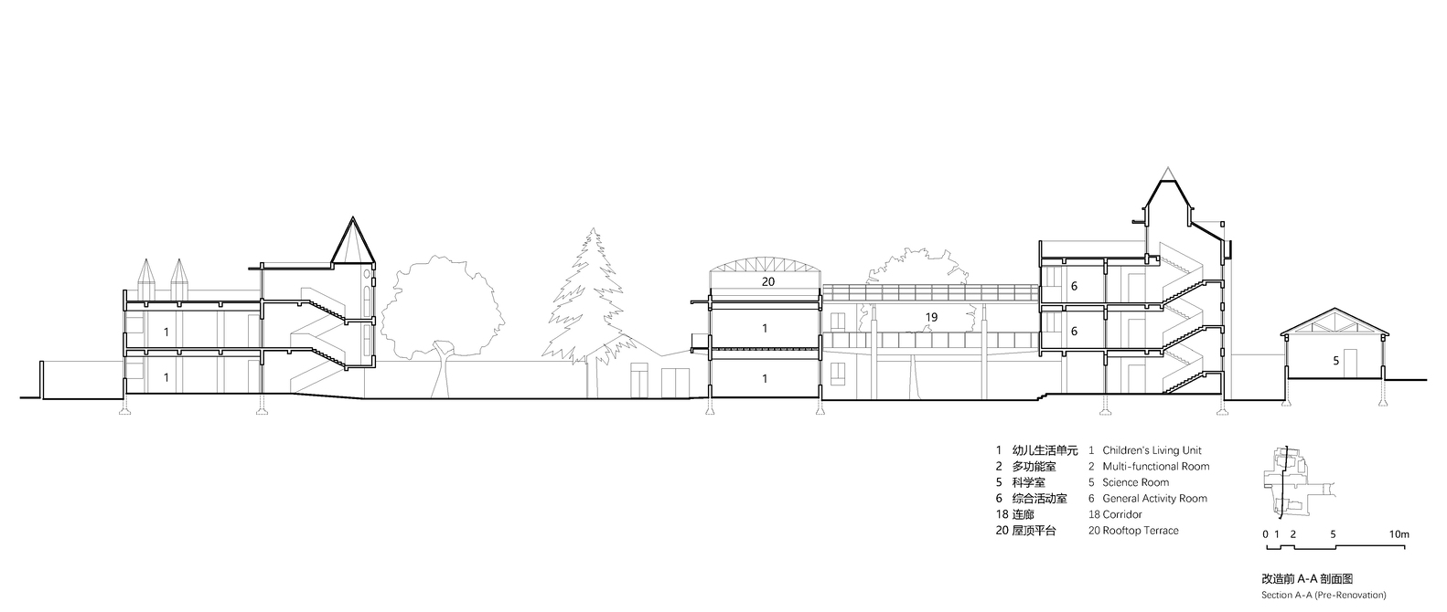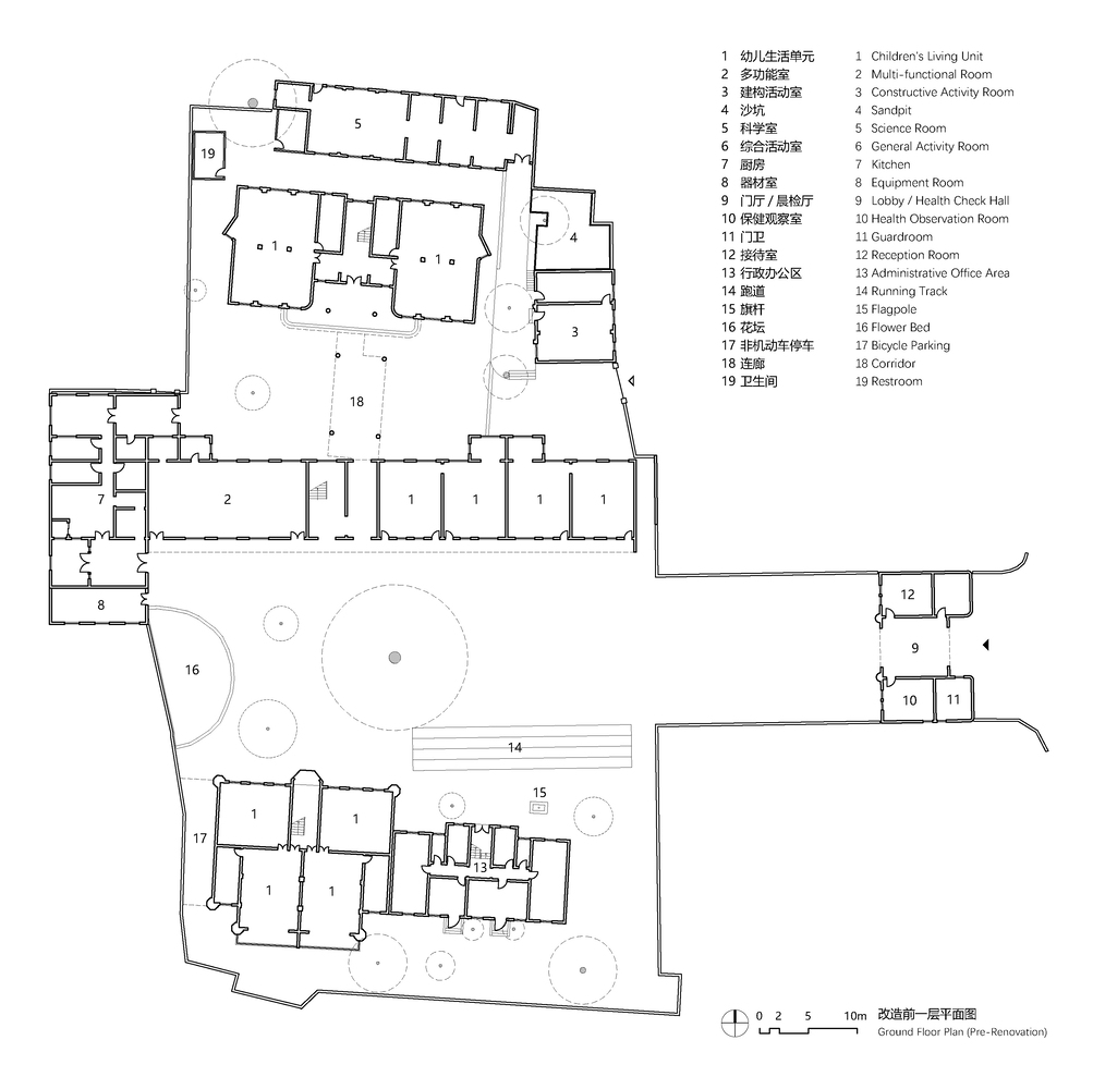 Only portions of the original walls of Building 2 are retained; the structural system is entirely replaced, shifting from the original brick-and-concrete bearing walls to a reinforced-concrete frame that meets kindergarten safety codes.