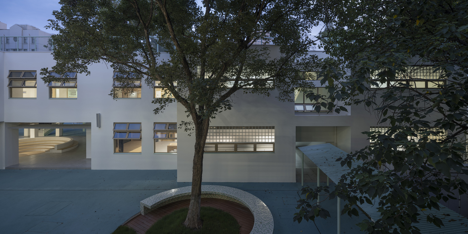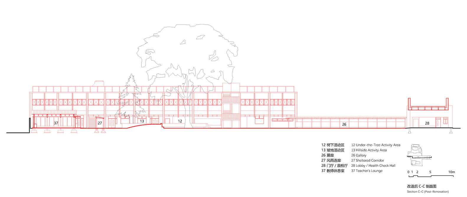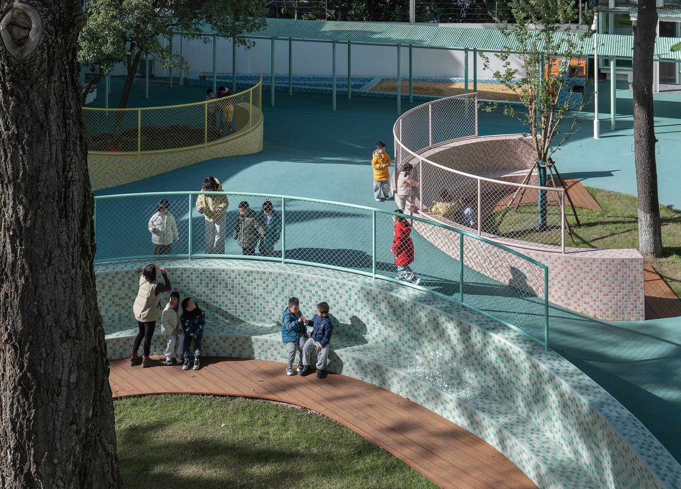In the open ground floor of Building 2, a sunken mini theatre is inserted; the curved wall that forms its seating, the curved exhibition wall behind the stage of the multi-functional room, and the curved doodle wall enclosing the outdoor craft area echo the curved walls that encircle the under-the-tree activity areas, creating a coherent dialogue between architectural and landscape elements.