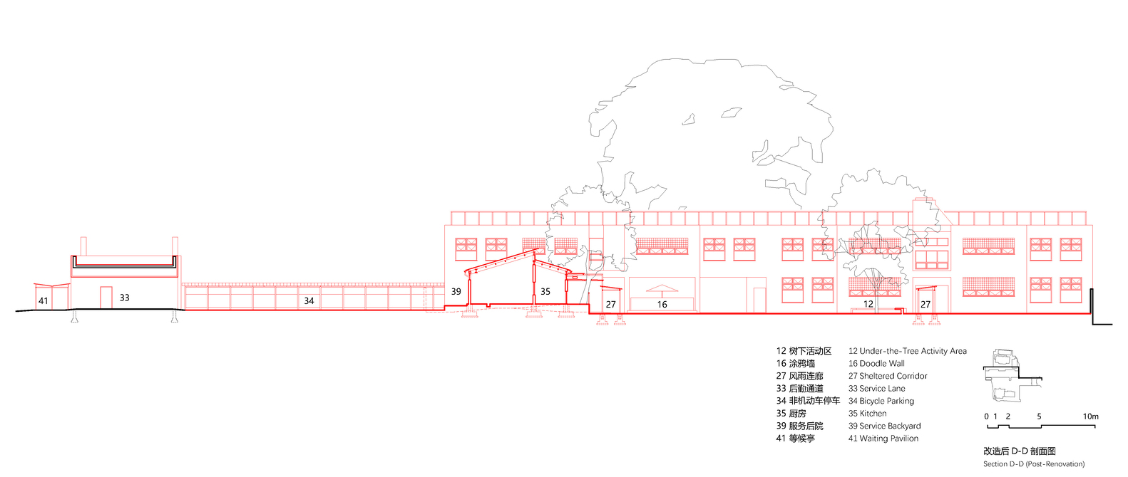 This structural replacement enables spatial expansion and transformation. The 2nd-floor exterior corridor of Building 2 is widened from a 1.2 m cantilevered balcony to a 2.8–3.2 m colonnade.
