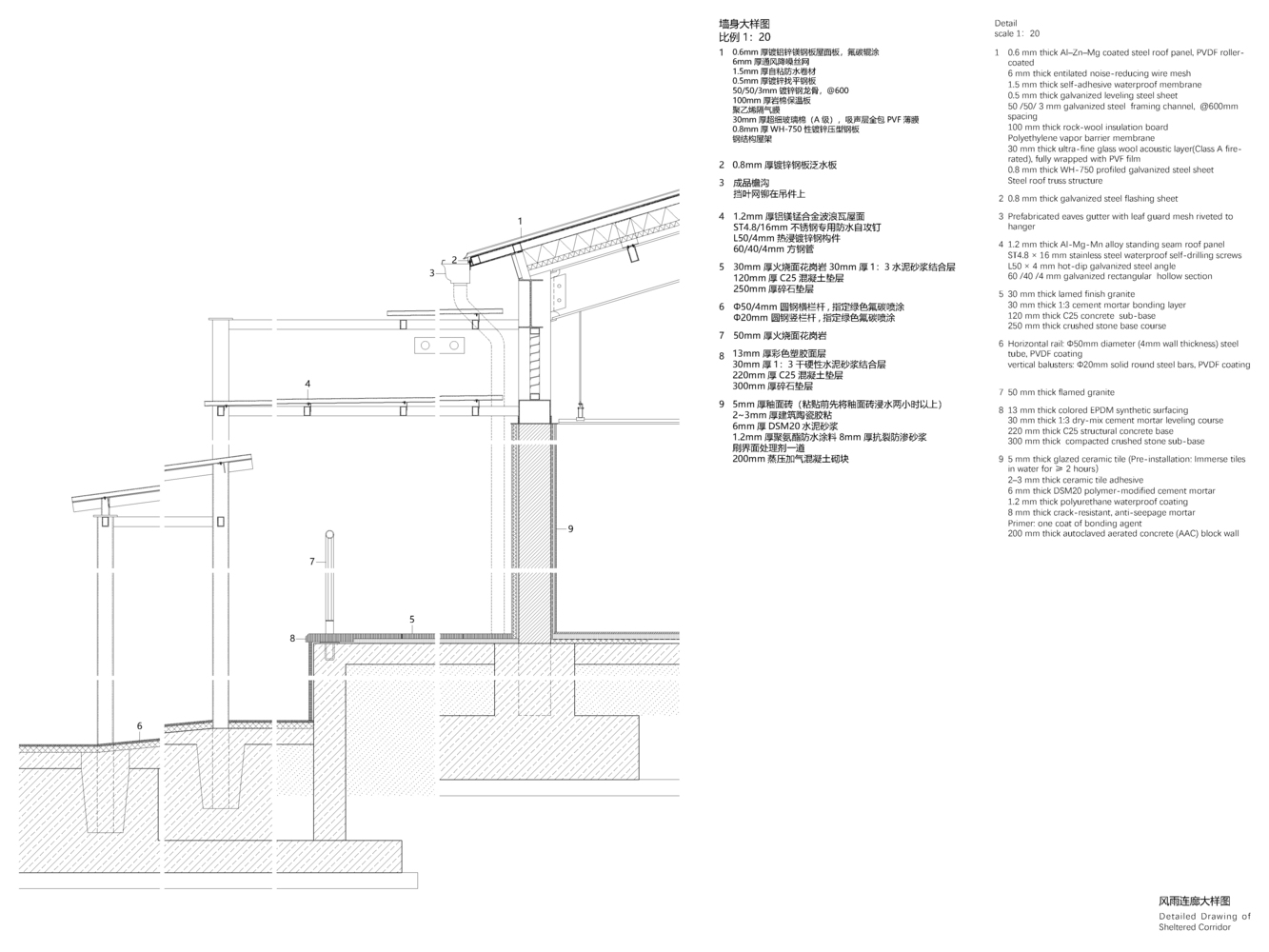 Beyond providing shade and shelter, the corridor recalibrates the scale of the outdoor spaces, adding a human-scaled layer to the entire site.