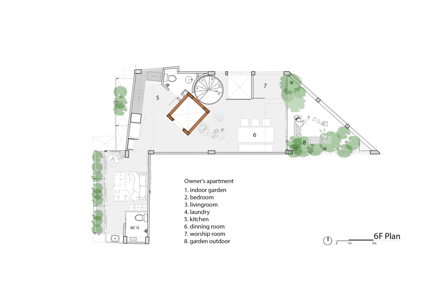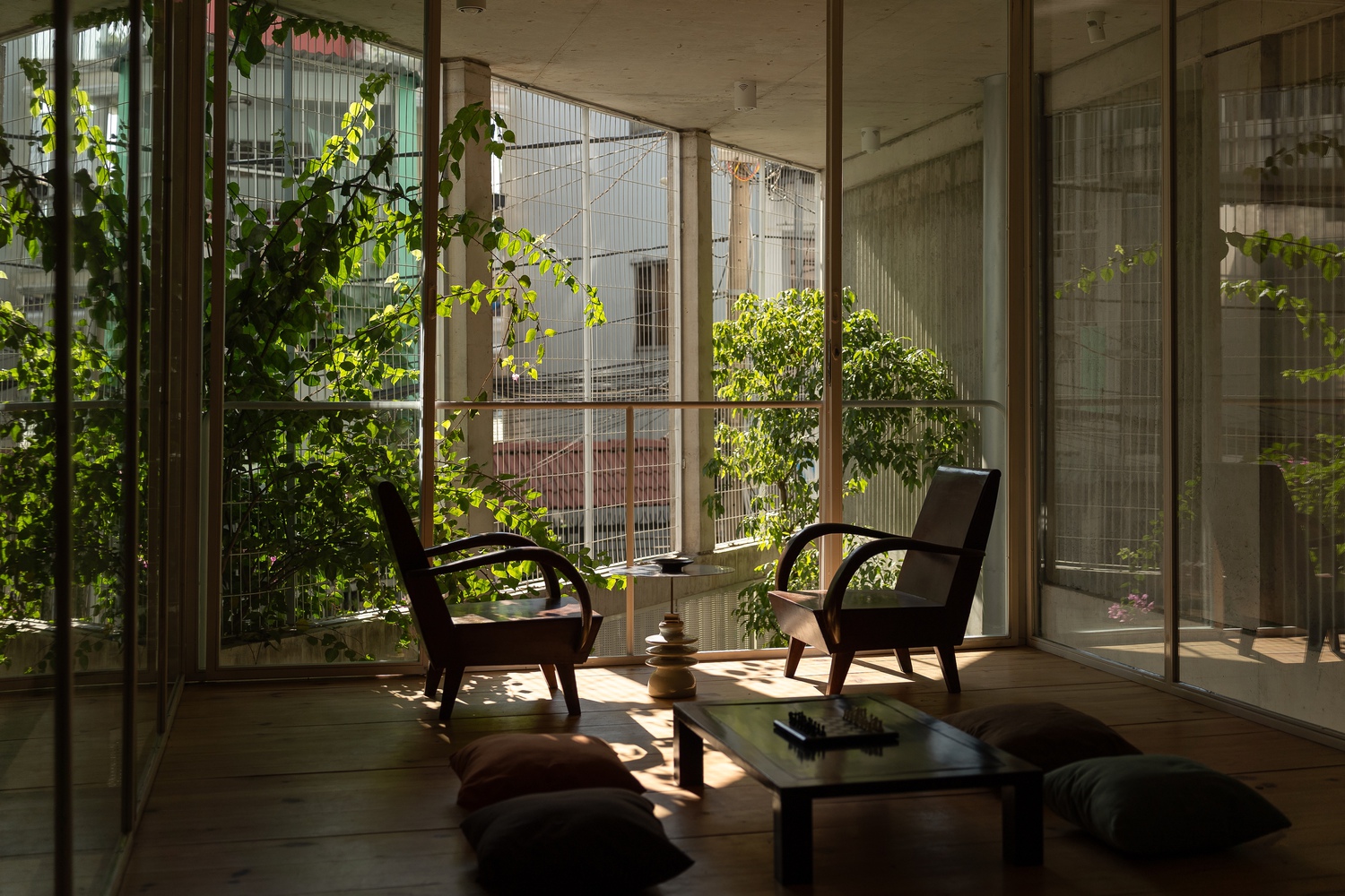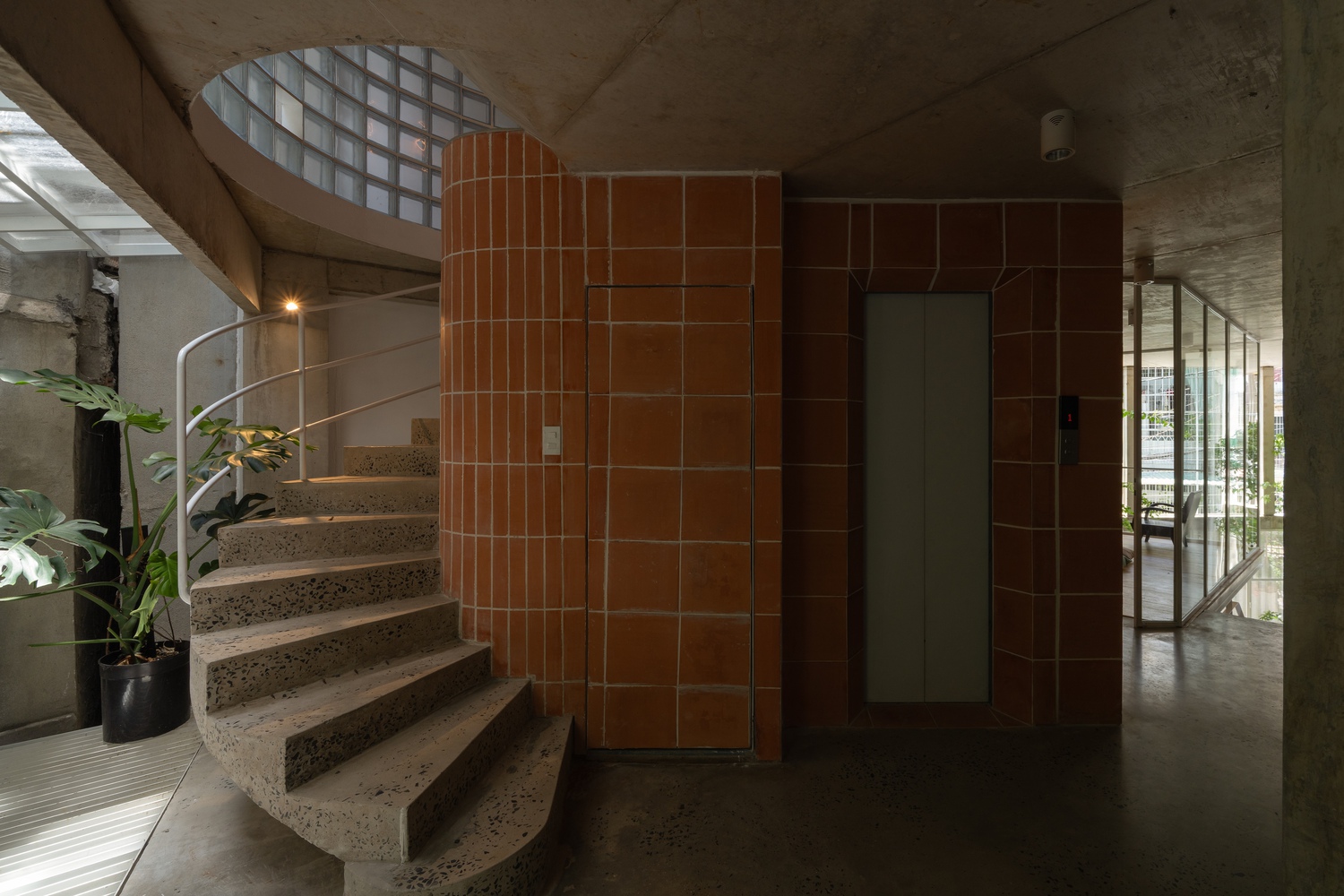 Floor lobbies are designed as semi-public spaces that improve airflow and visual openness, while also extending the apartments for activities such as receiving guests, reading, or other activities in an in-between garden.