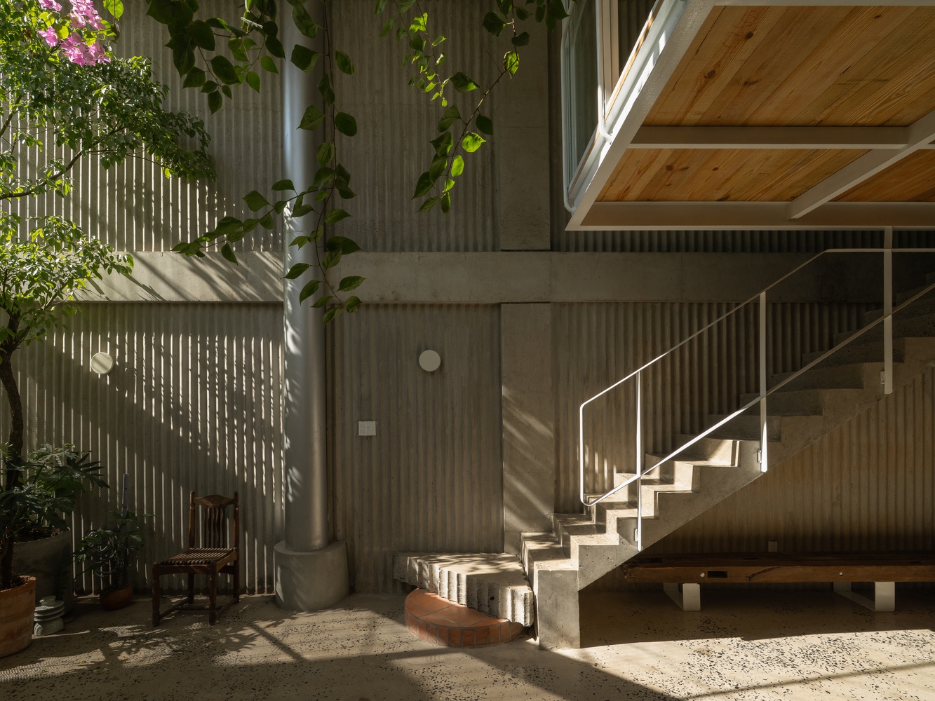 The ground and mezzanine levels are kept open with minimal partitions, creating a seamless transition from the alley into the house.