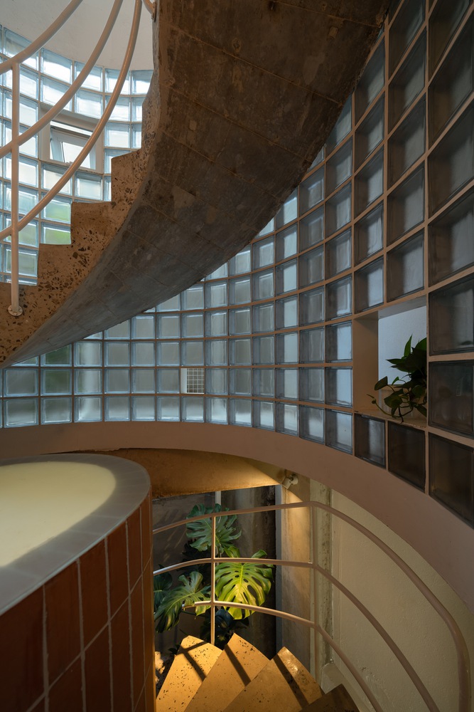 At the rear of the house, a vertical garden facing west provides shading while working in combination with the staircase and louvered panels above the room door openings to enable natural cross ventilation from back to front.