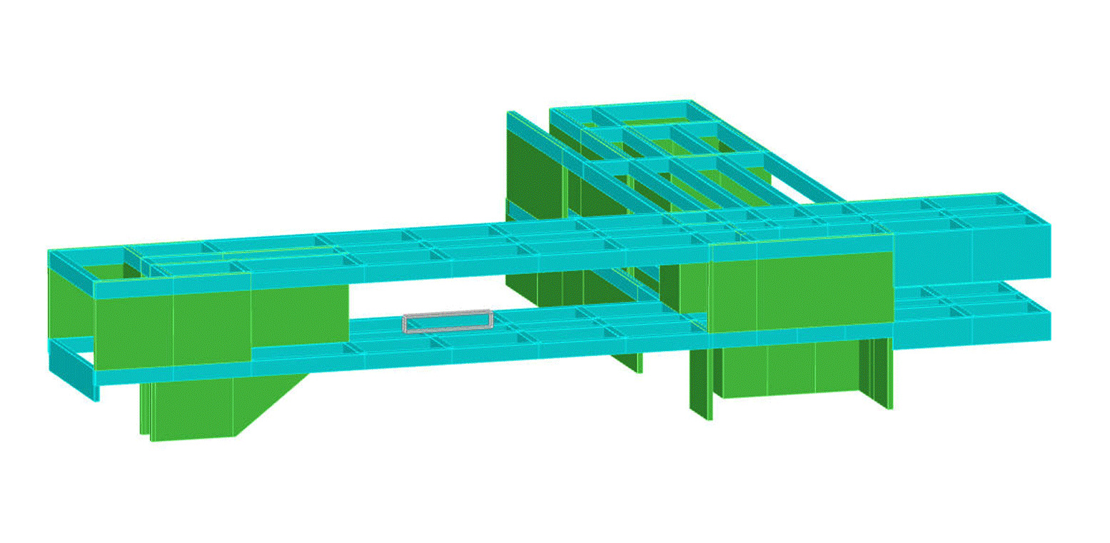 Loads are carried through end staircases, side walls, and staggered partitions to a raft foundation. Long vertical windows, paired with motorized openings at both ends, provide cross-ventilation and weaken the structural mass.