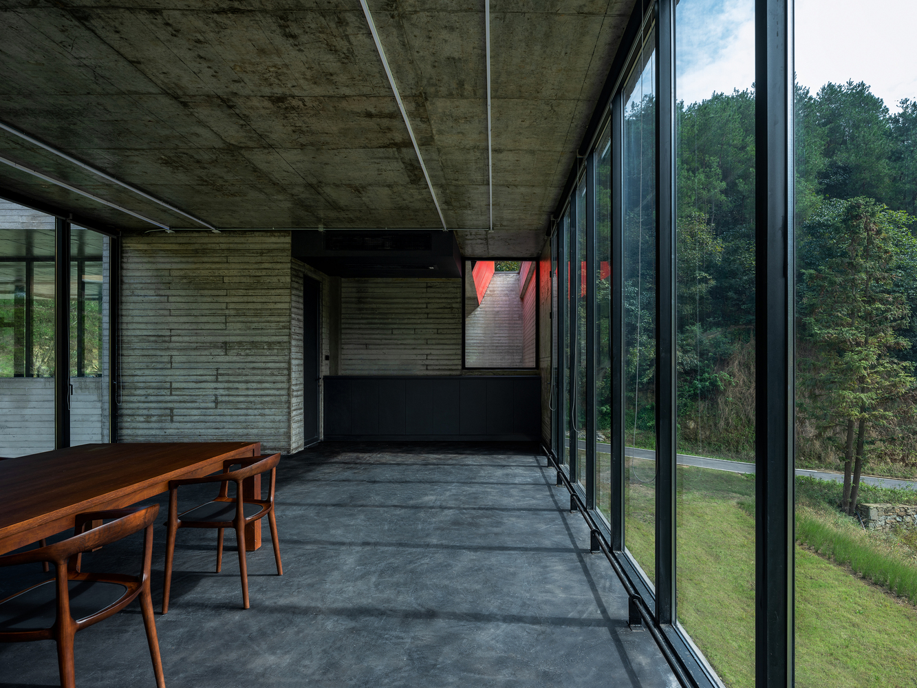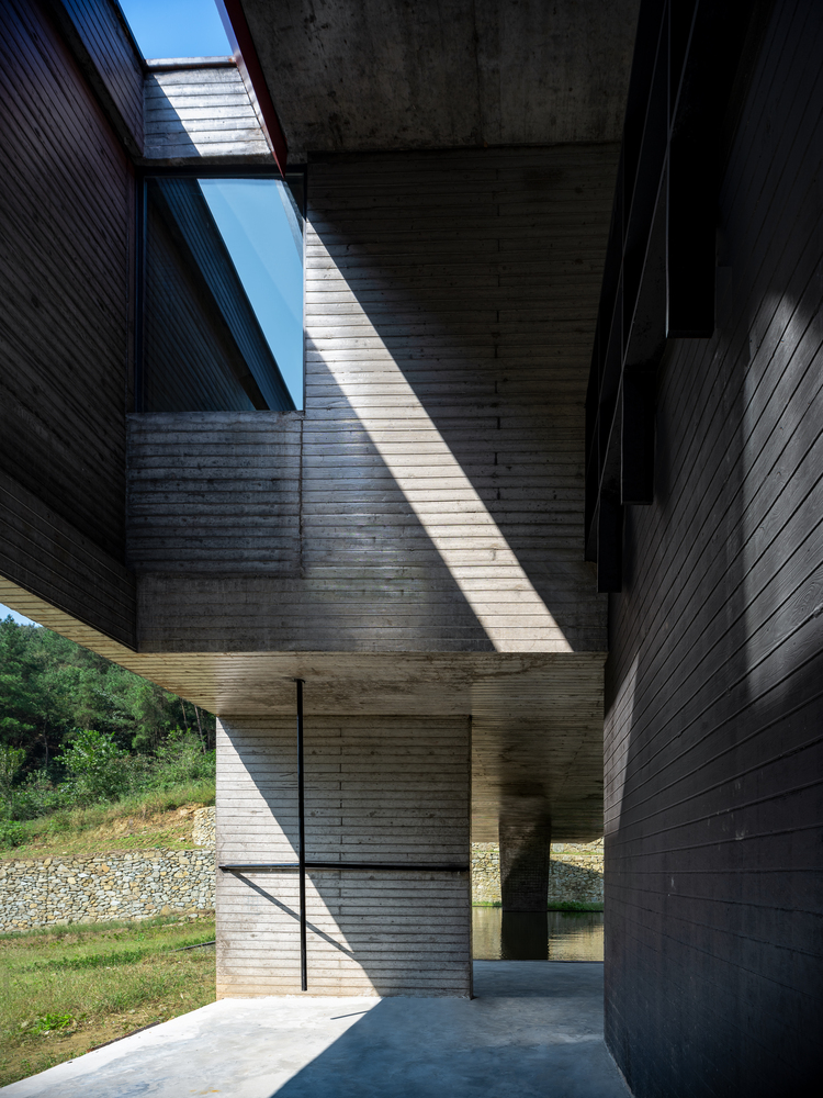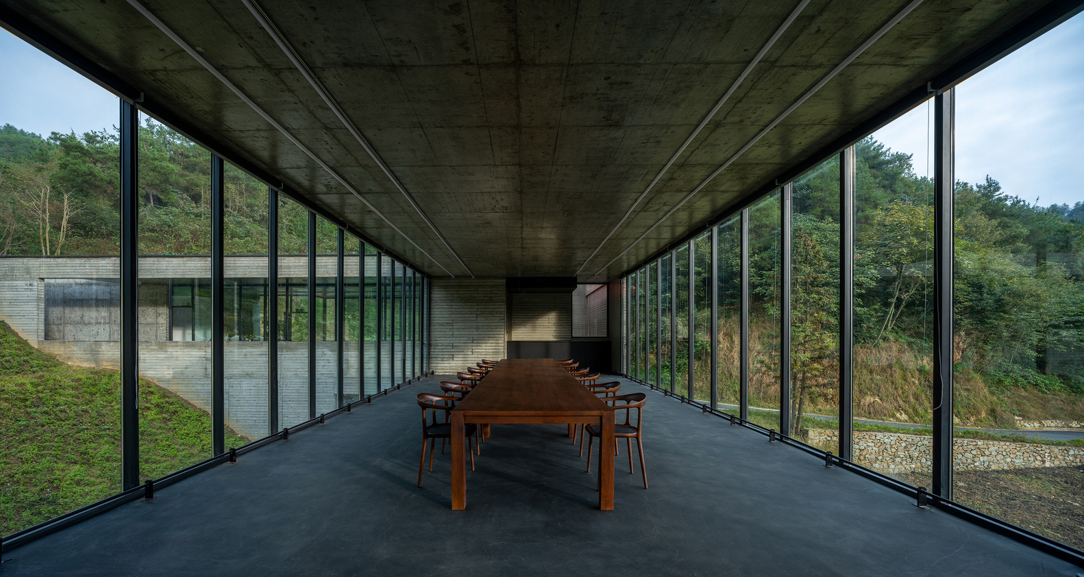 Three light courts are inserted into the solid concrete form, aligned with circulation routes. The "Vertical Light Court"—a 7.5-meter cube—connects the restaurant, kitchen, and meeting room horizontally, while vertically linking people to sky and ground through shifting daylight.
