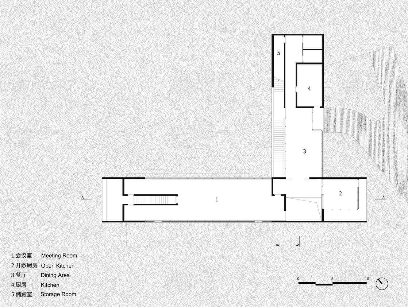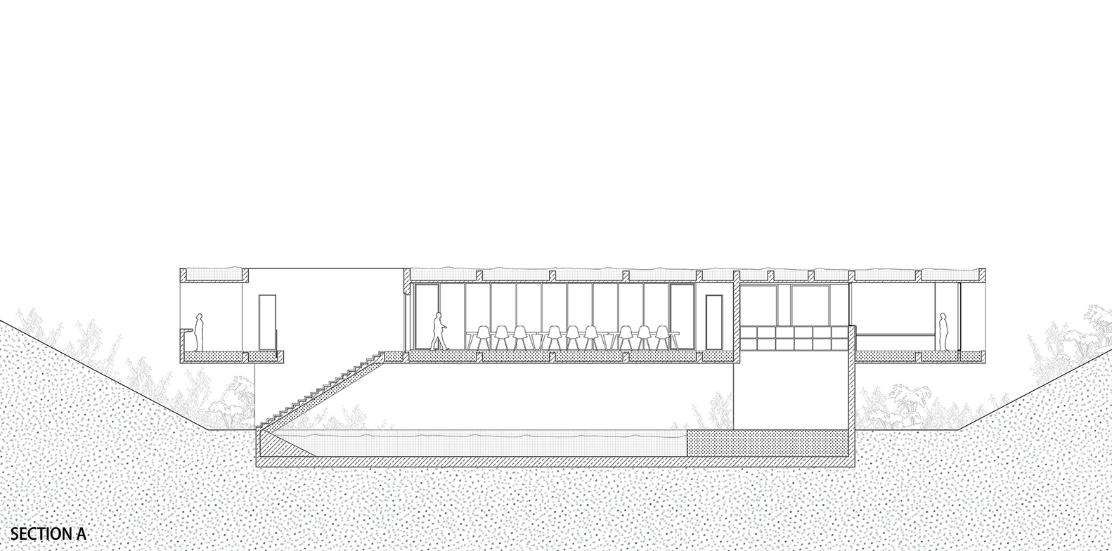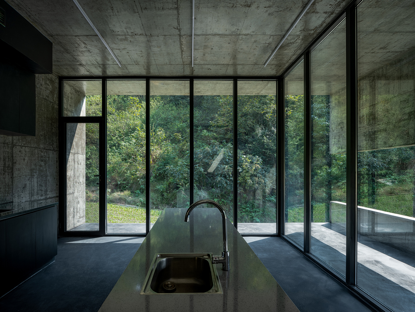 Three light courts are inserted into the solid concrete form, aligned with circulation routes. The "Vertical Light Court"—a 7.5-meter cube—connects the restaurant, kitchen, and meeting room horizontally, while vertically linking people to sky and ground through shifting daylight.