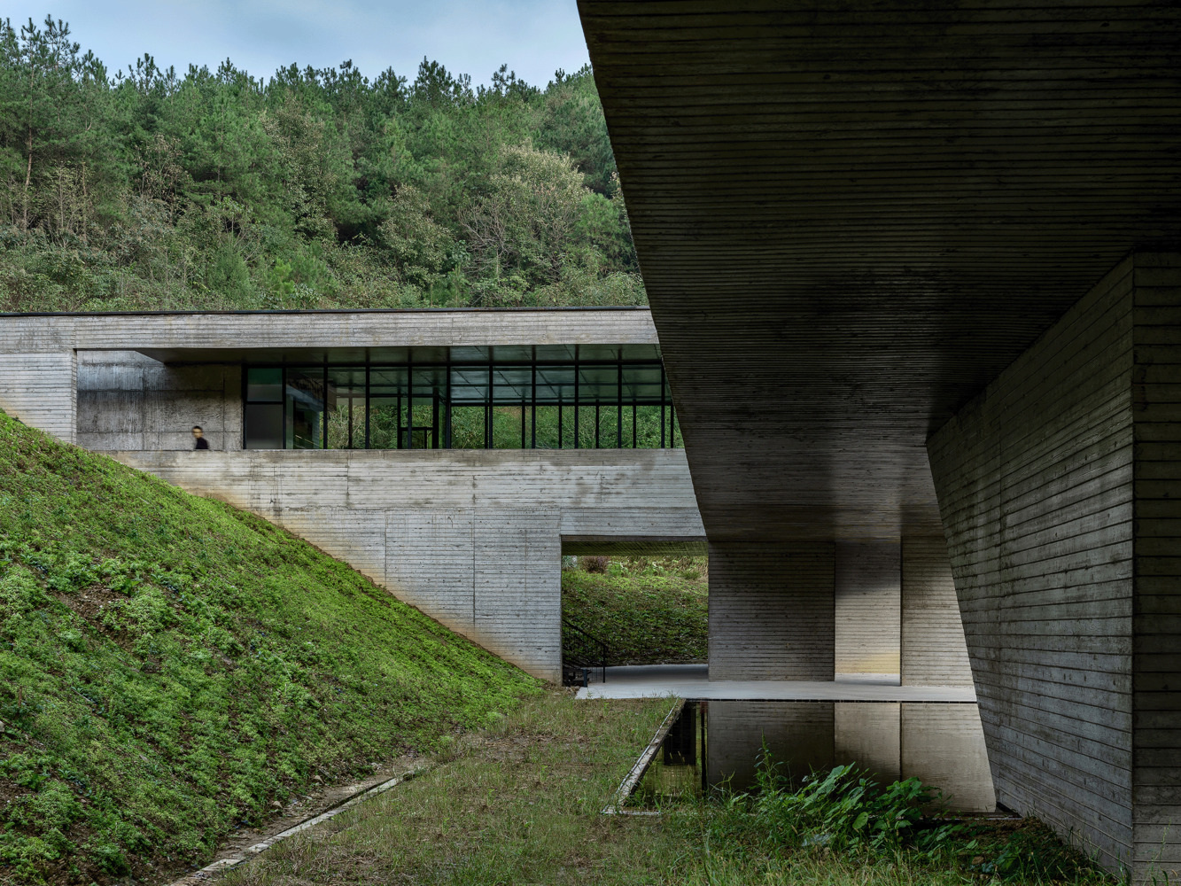 The result is a building that reads simultaneously as an inhabitable gallery and a geometric bridge—an intervention that responds to the altered terrain while asserting a quiet architectural order within the surrounding wilderness.