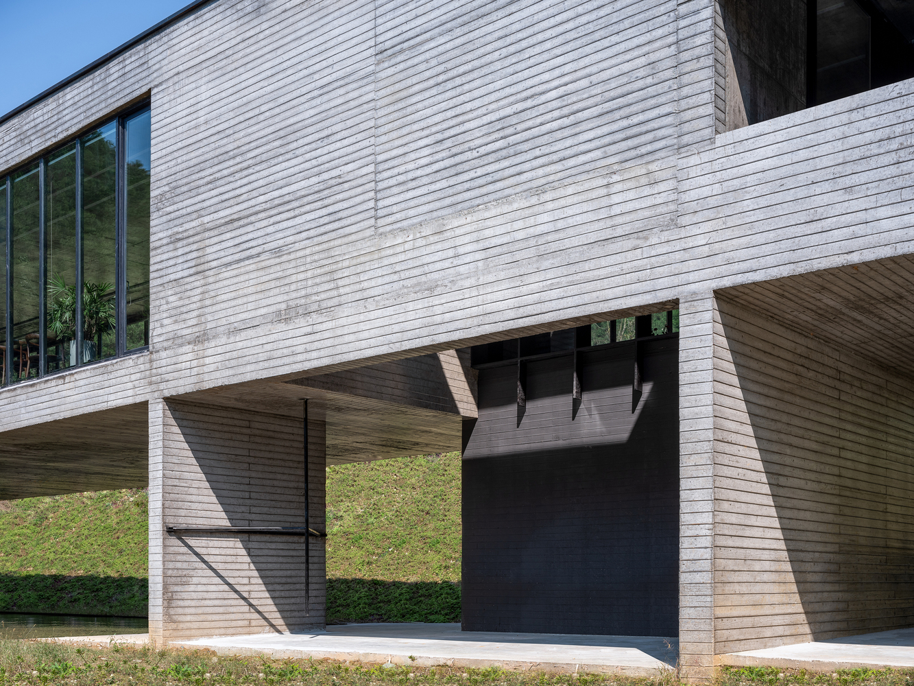 Budget constraints led to the use of 150mm-wide prefabricated wooden planks as concrete formwork, producing surfaces with strong grain, rhythm, and directionality that soften the abstraction of the concrete volume.