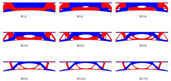 The north–south frames are light‑weighted via BESO, which identifies principal tension‑compression trajectories under given load cases, then translates the topology into an I‑beam system, reducing members and joint complexity. The undulating brick façade and the optimised steel skeleton are conceived as a single continuum, aligning aesthetic form with structural logic.