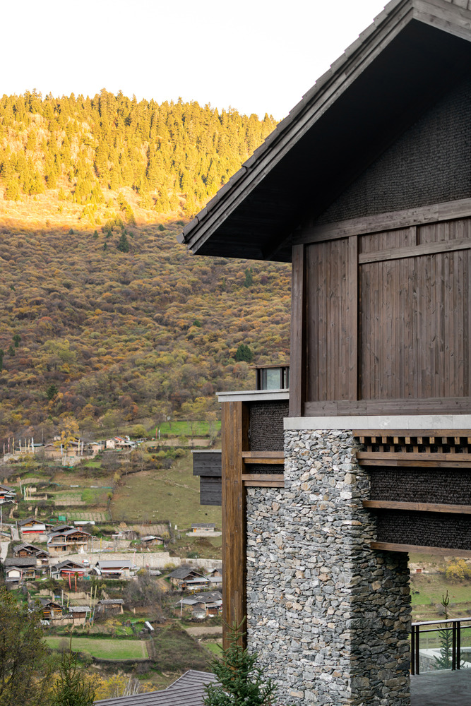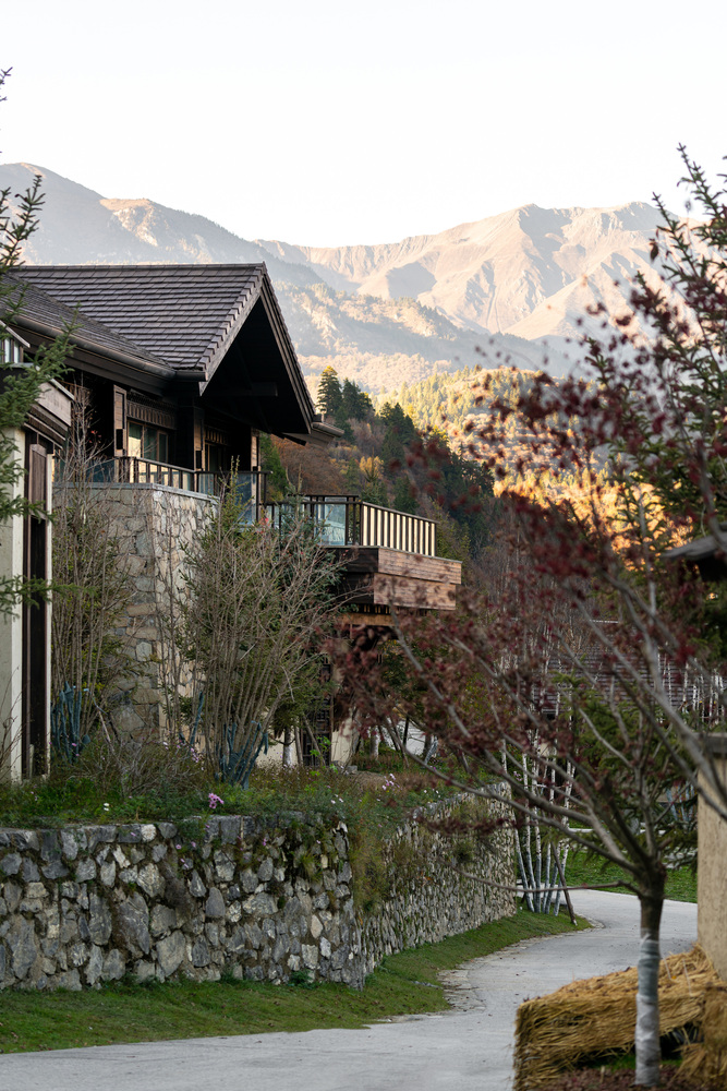 Rooted in Tibetan-Qiang culture and Sichuan-style architecture, the hotel lies on a west-high-east-low hillside (2,400m max elevation, 89m vertical difference) across from the authentic "Bori'e Village". Its 166,088㎡ site (36,217㎡ gross floor area) holds 87 luxury villas, public areas, and a SPA.