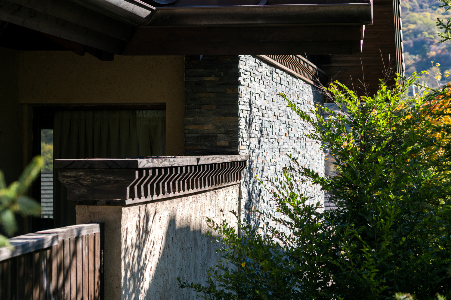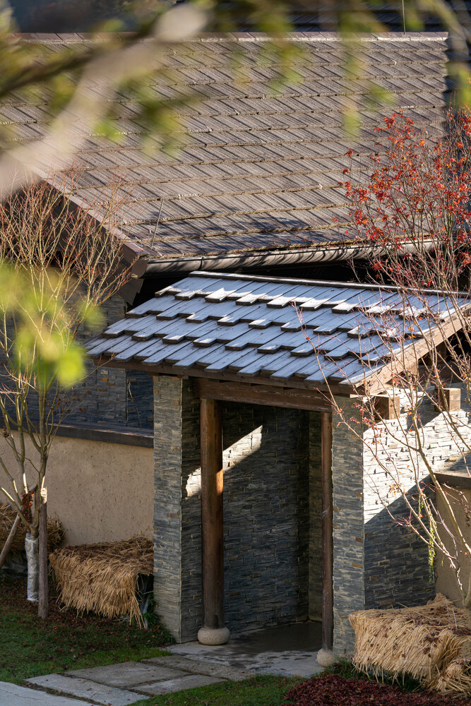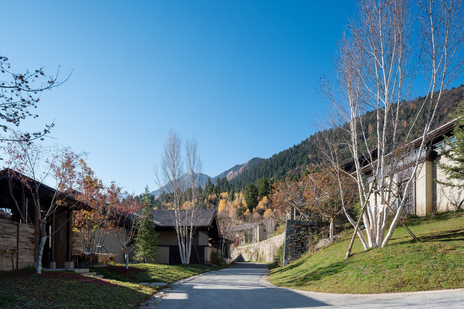 Guests access the hotel via a winding mountain road: after passing a village gate to reach public areas, they take a sightseeing vehicle with a butler to their rooms.
