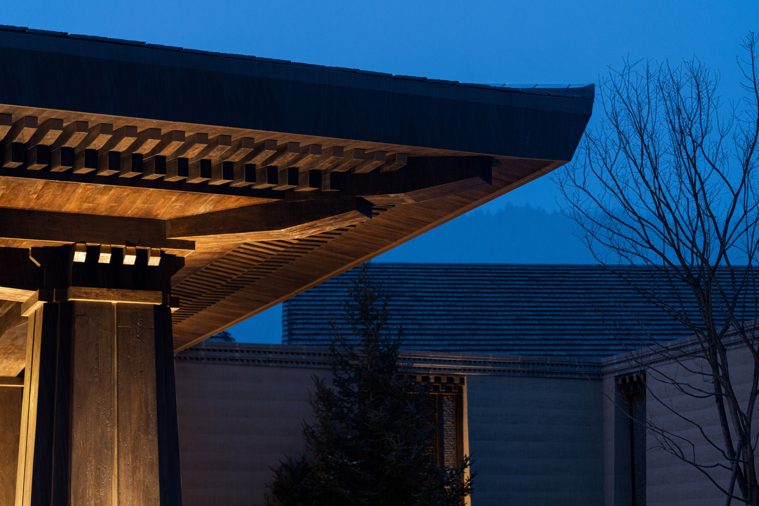Facades draw on Tibetan-Qiang watchtowers and plank houses, with three-section structures, gable-hip roofs, and rammed earth-style walls; details like "Bianma Wall" are reinterpreted.
