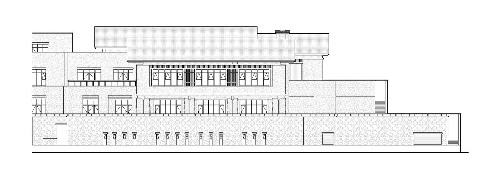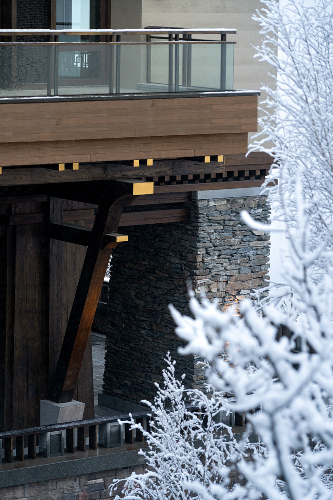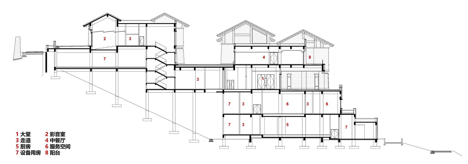 Buildings adopt Tibetan stilted-house forms: guest rooms have 1 above-ground living floor (for views) and 1 stilted service floor; public areas have 2 above-ground floors and 3 stilted floors.