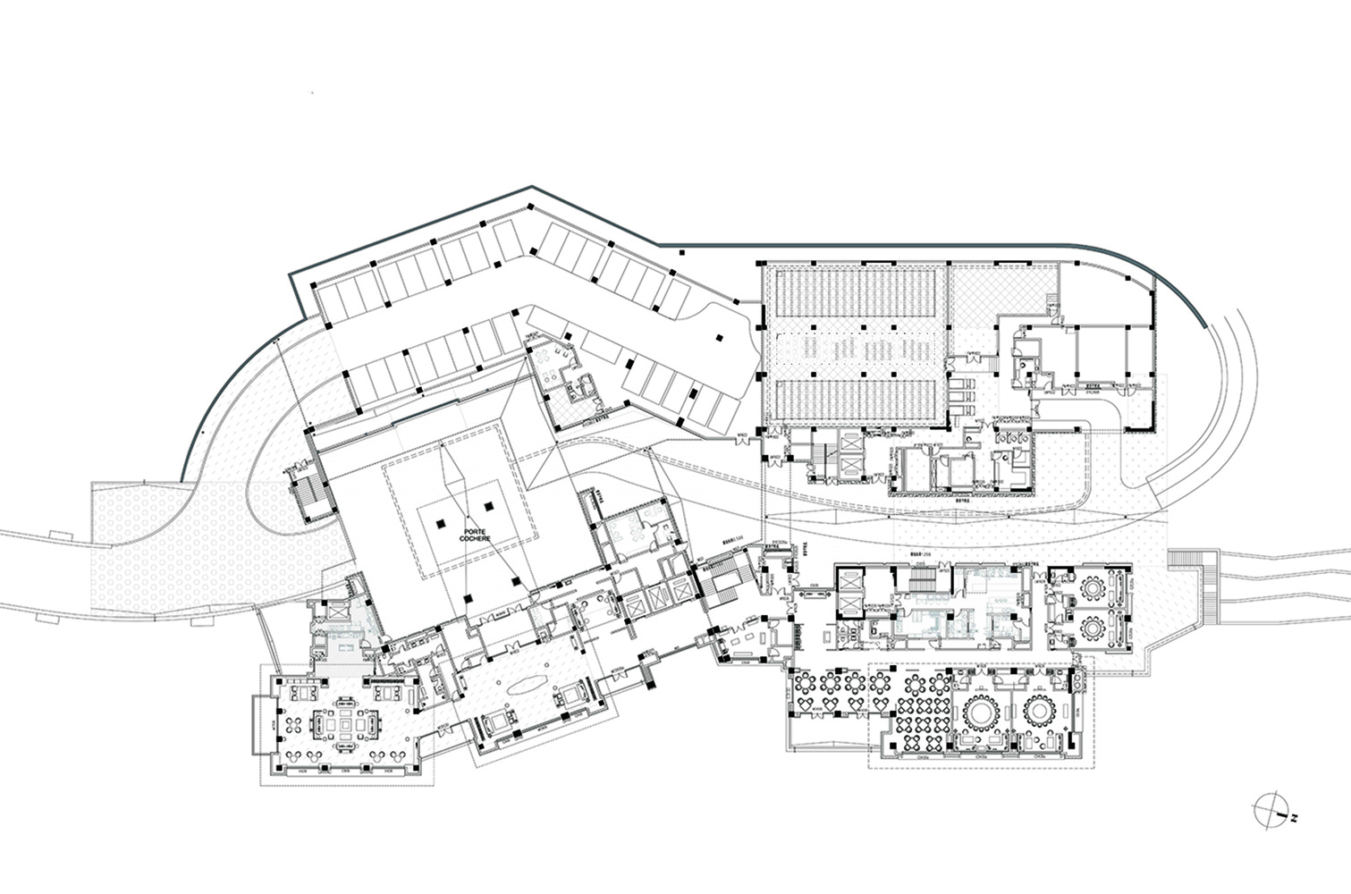 Courtyards (drop-off "front courtyards", guestroom "small courtyards") transition from open to private.