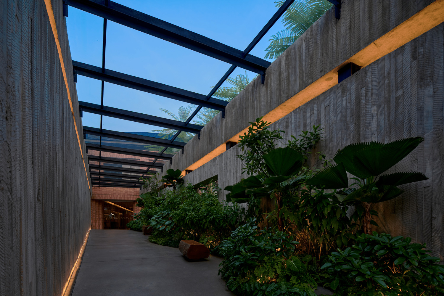 More than a circulation path, this bridge is a lush promenade lined with tropical plants and gardens, creating an elevated, green arrival.