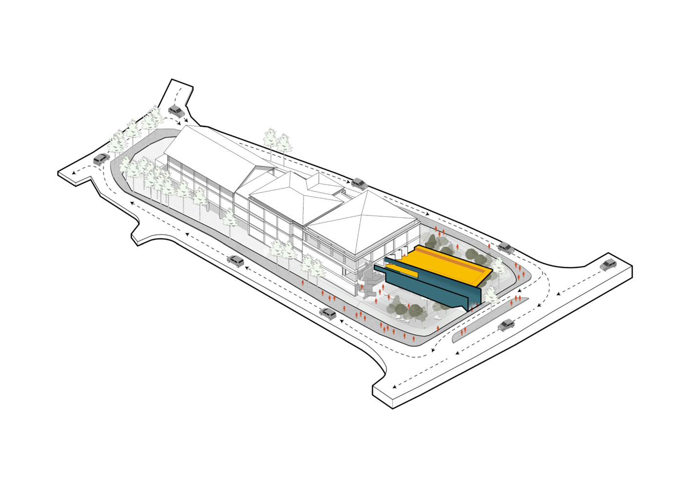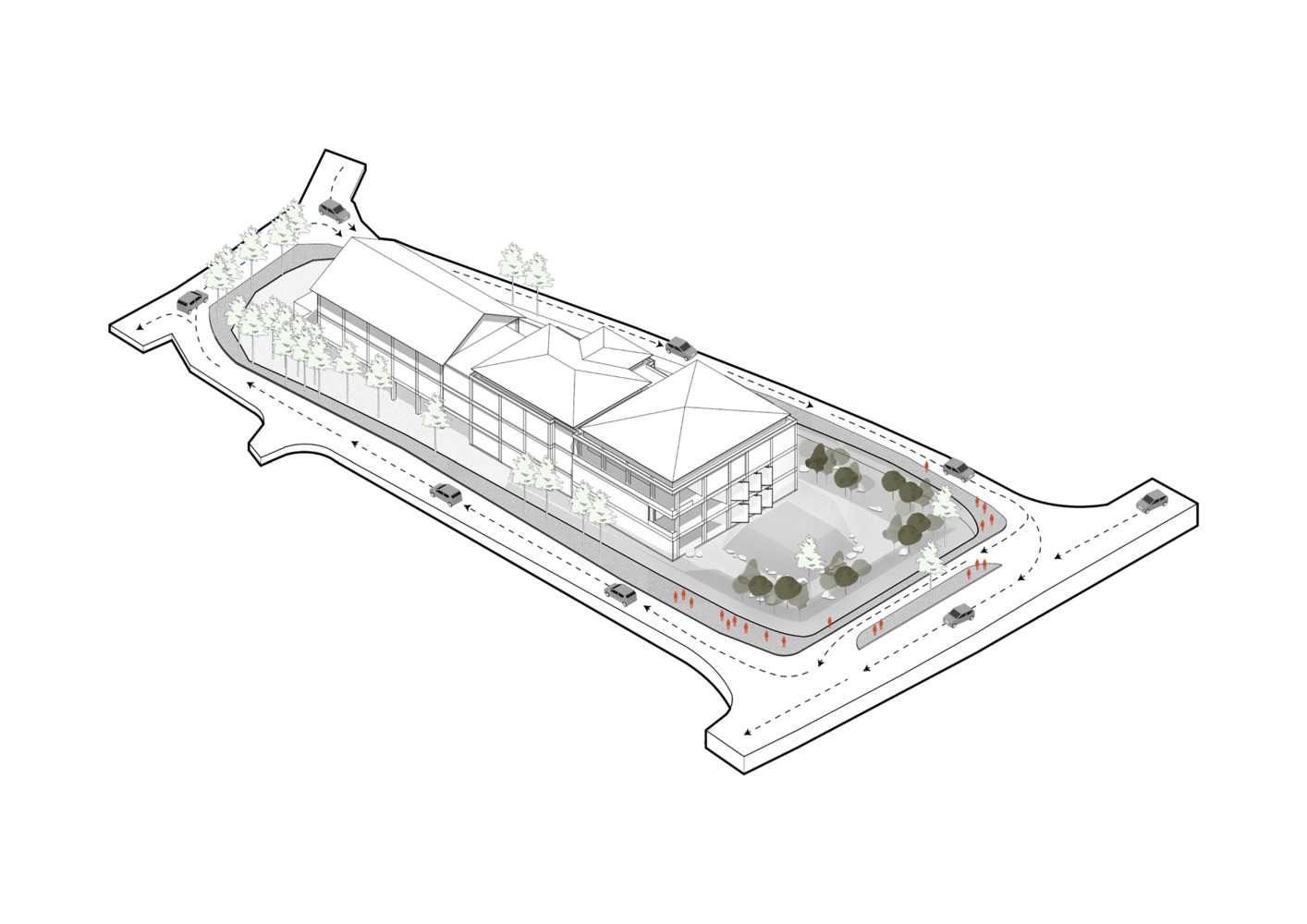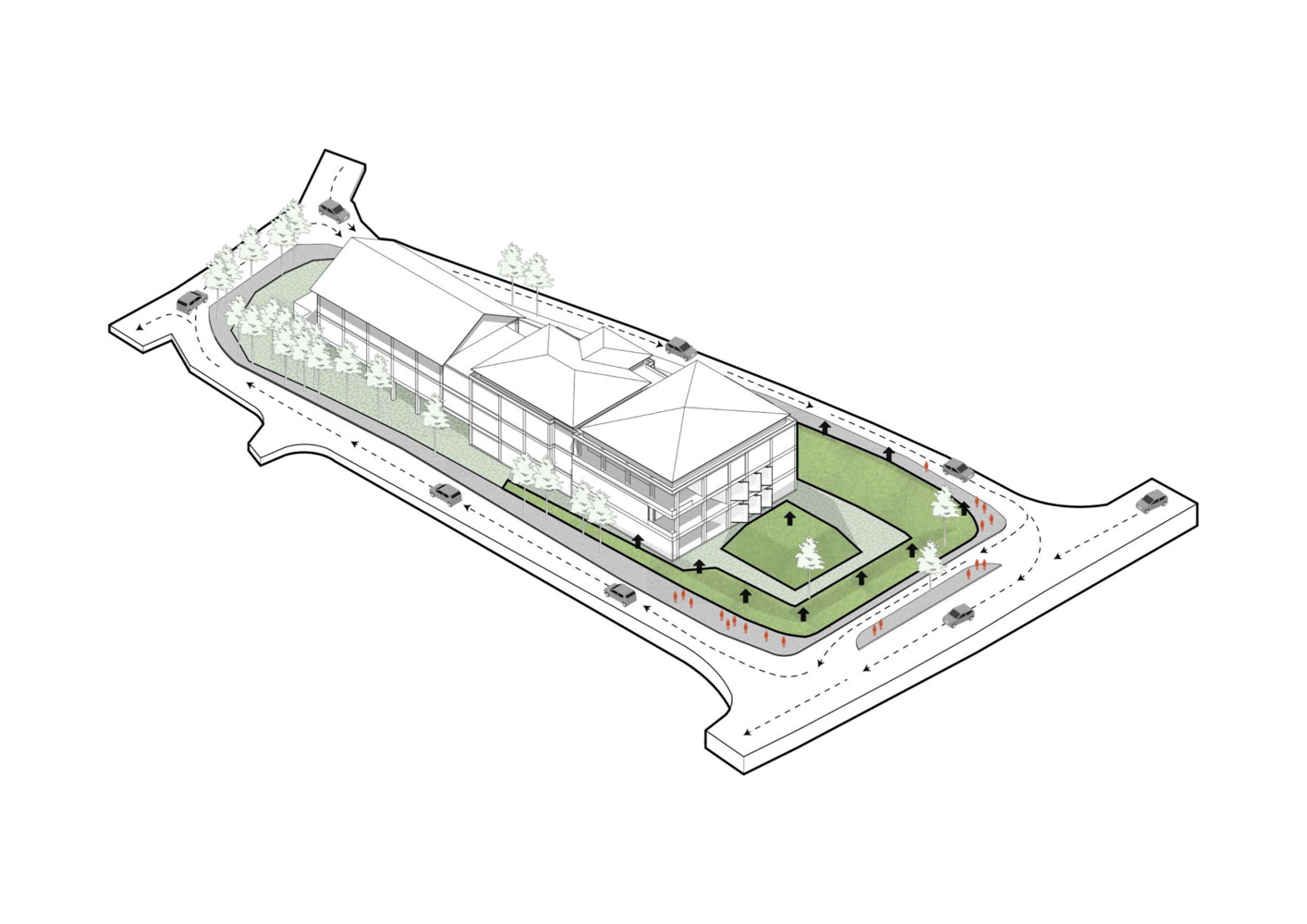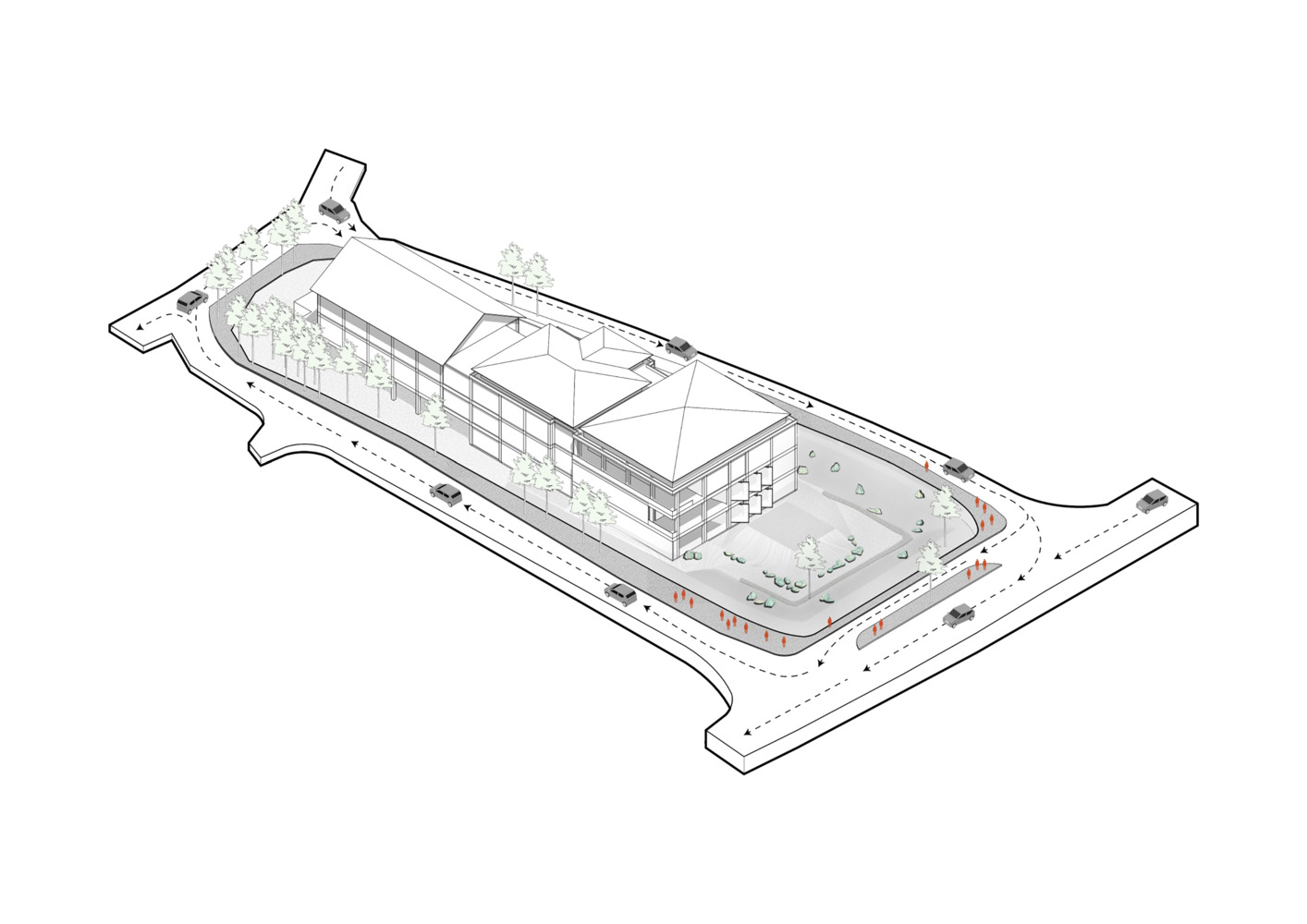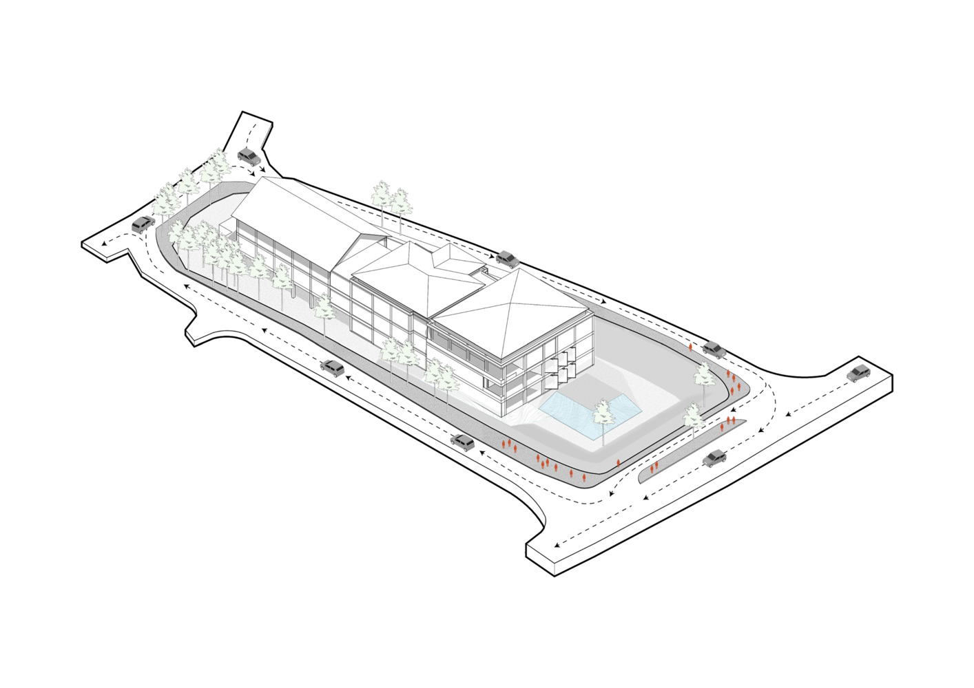 The existing building sits lower and 35 meters from the main road, prompting a design response that reconnects it to the street with a four-meter-wide bridge.