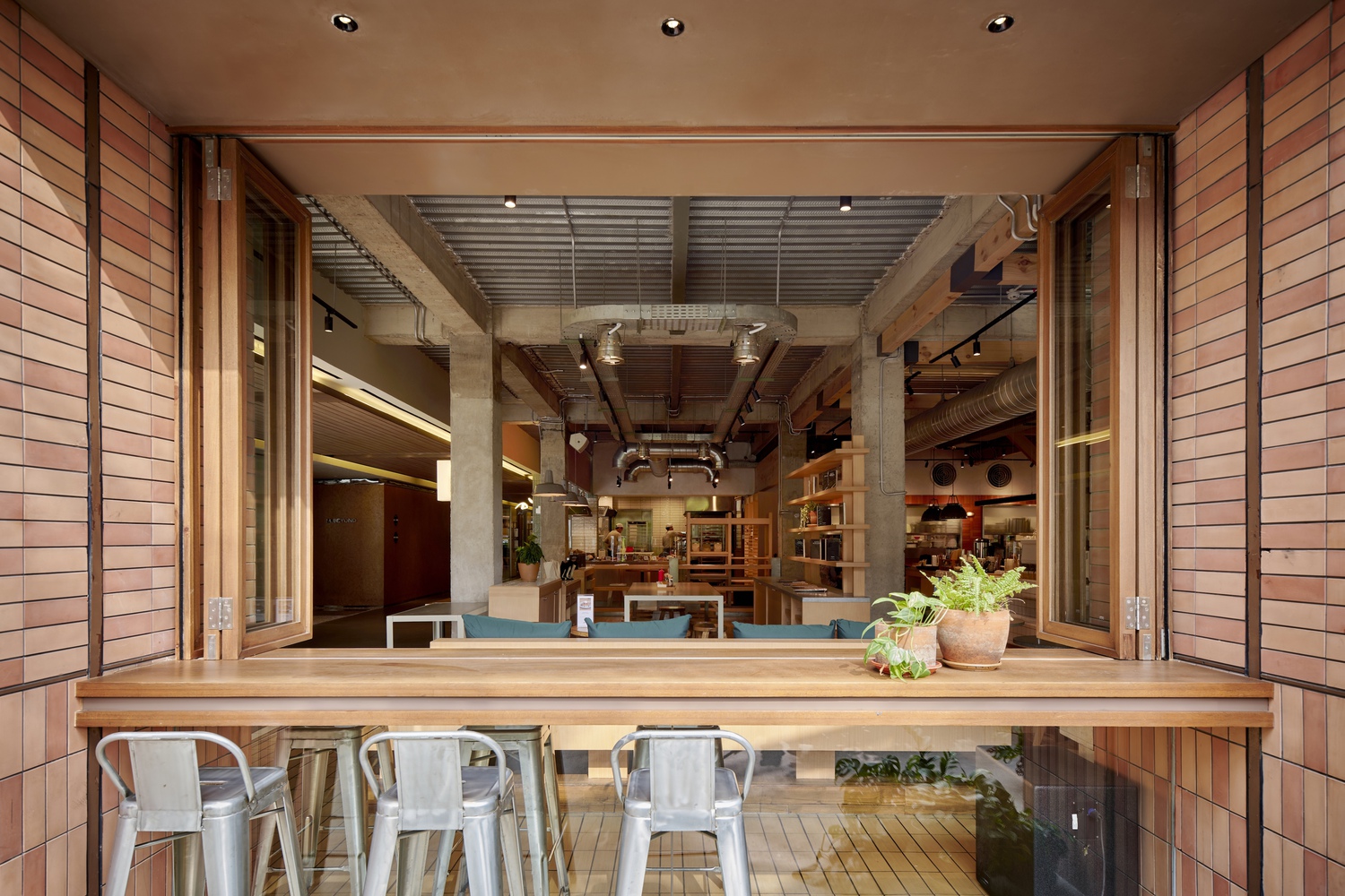 Extending toward the main road, the project introduces outdoor seating shaded by a rooftop garden, enhancing comfort while reducing heat gain.