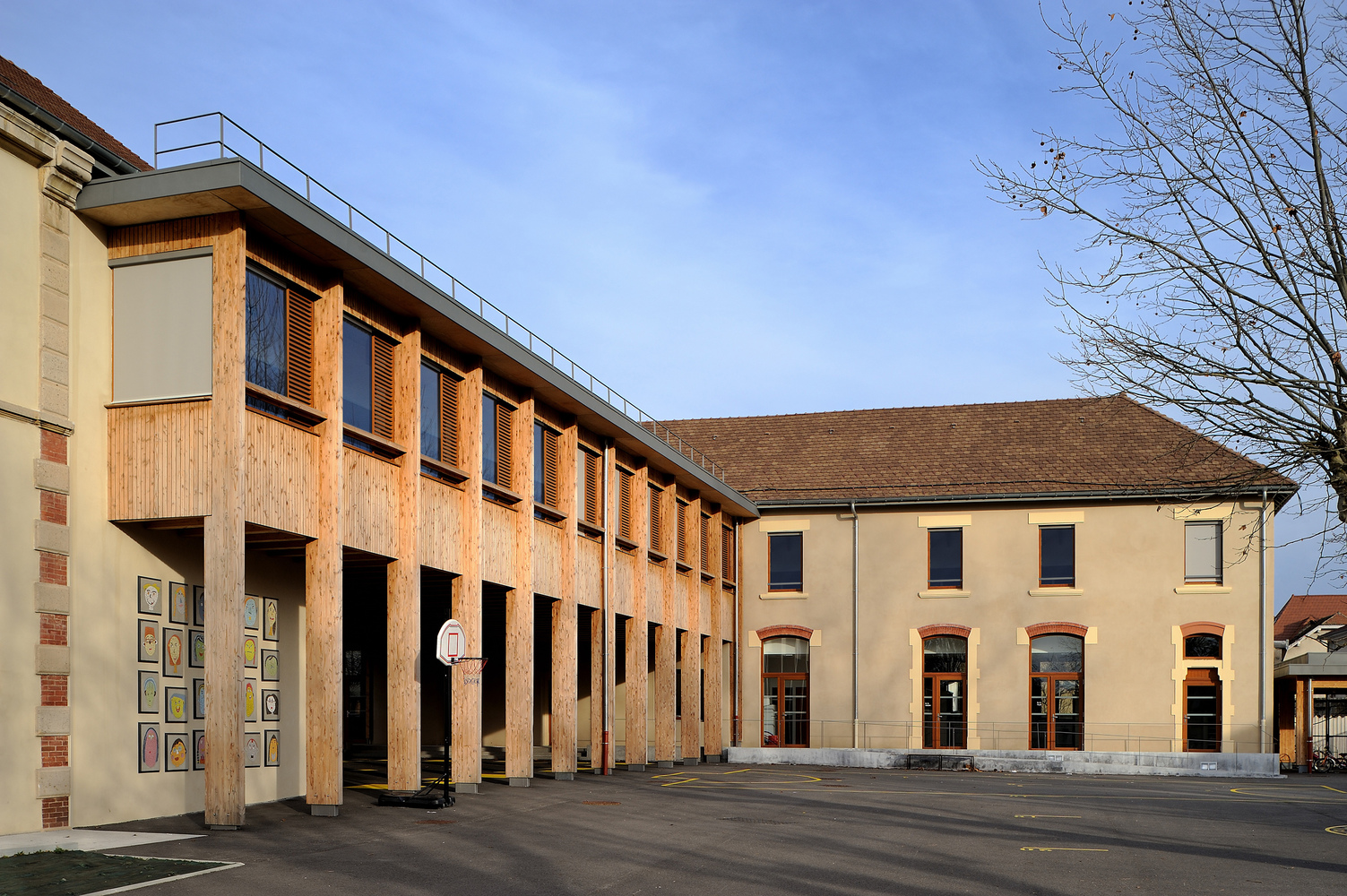 A resumption of outdoor spaces offering vegetable gardens to the west and public square to the east in connection with the street has made it possible to secure the flows of students and anchor the restructured and extended buildings in the center of the town The capacity of the school group is thus 15 classes, with a multipurpose room, a library, an activity room and administrative premises.