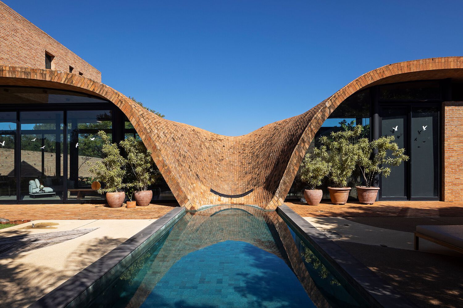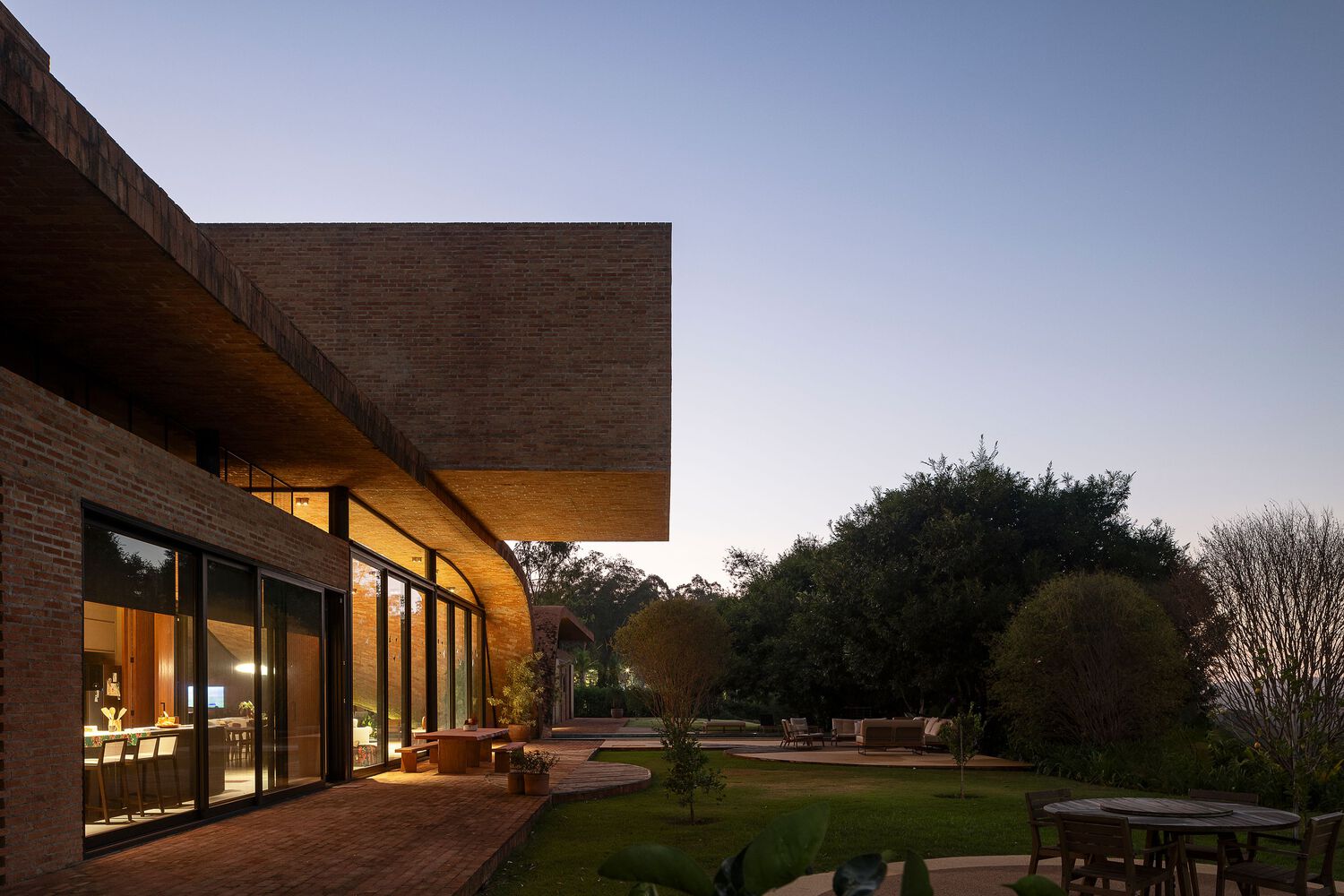 The exposed brick roof, with a pronounced curvature, is one of the central elements of the project. In addition to aesthetically marking the residence, it acts as a rainwater collector, directing it to the pool.