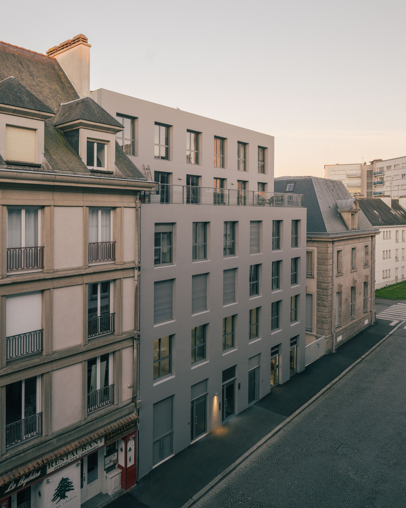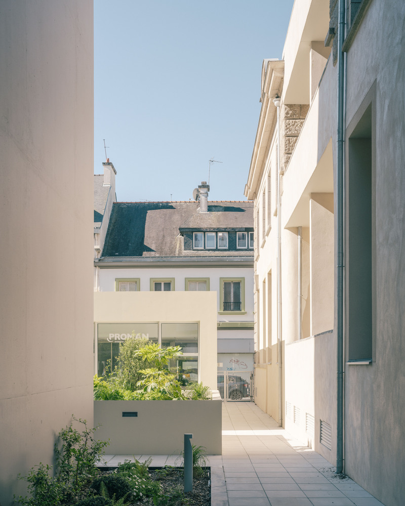 The two new constructions form a new layer between Place Alsace-Lorraine and Rue du Couëdic. The gap between the Banque and the new constructions introduces a public character while highlighting the institutional building.