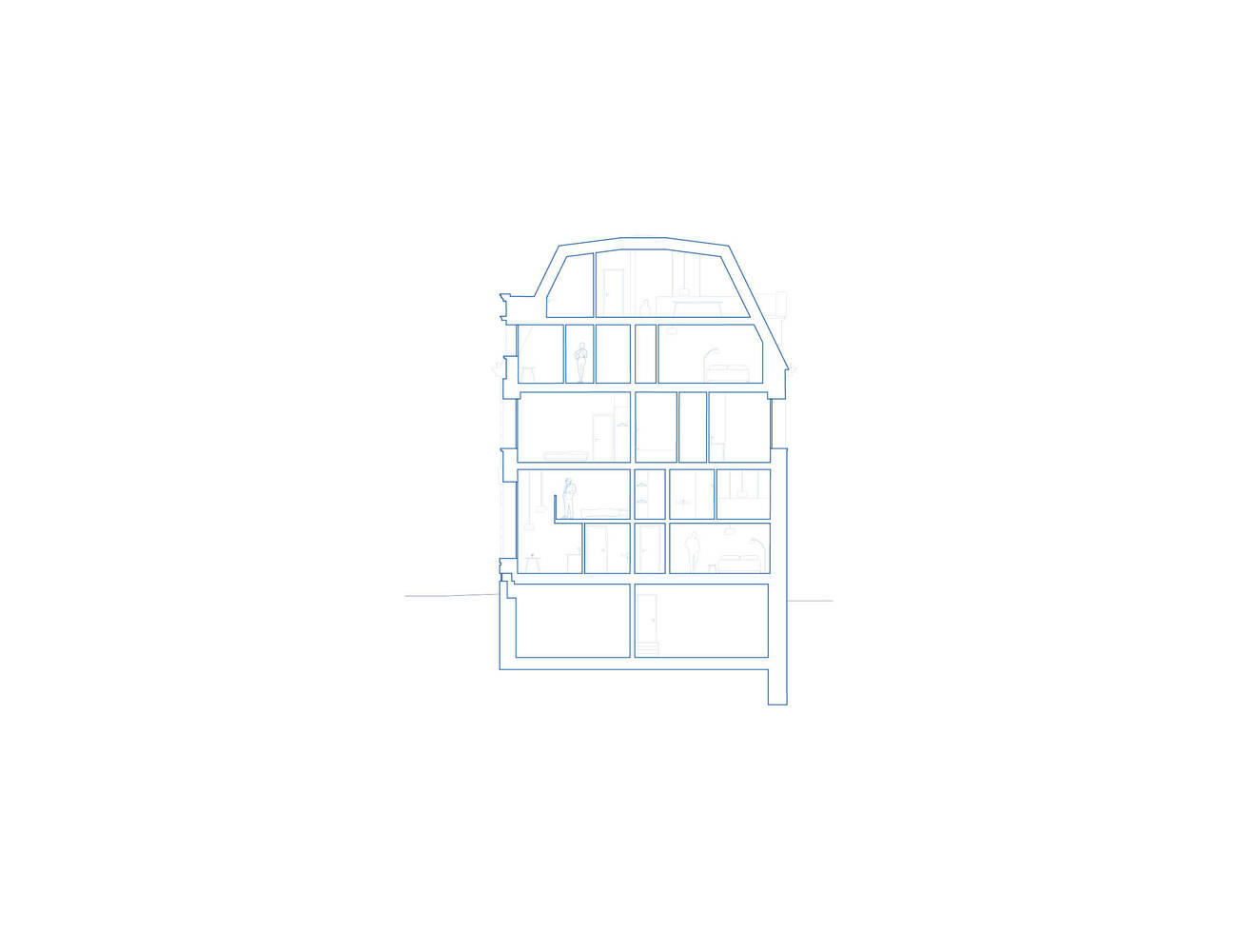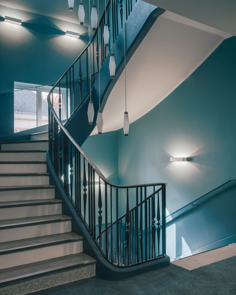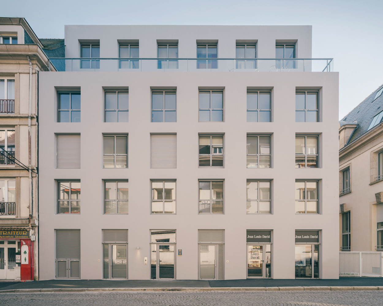 The setback of the top floor, as well as the rhythm and size of the windows, create unified façades that harmoniously integrate the new building into its context.