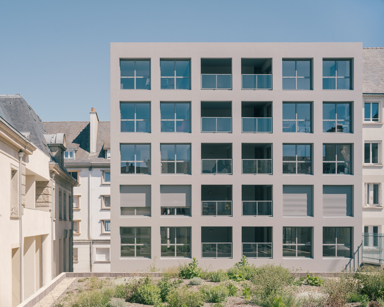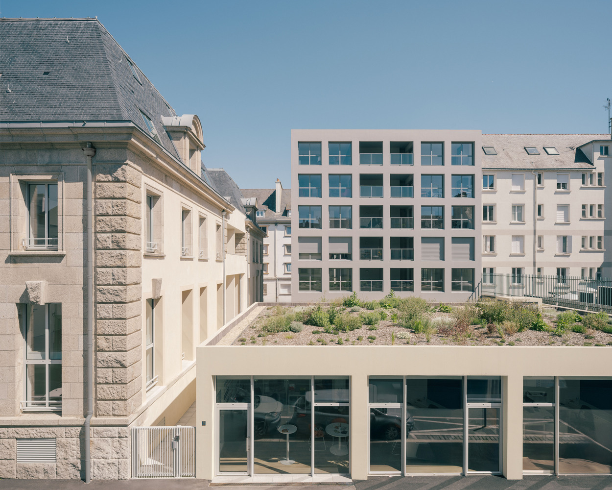 A five-story volume along Rue Clisson and a second, ground-floor volume along Rue Vaubanet create a gap with the rehabilitated Banque de France.