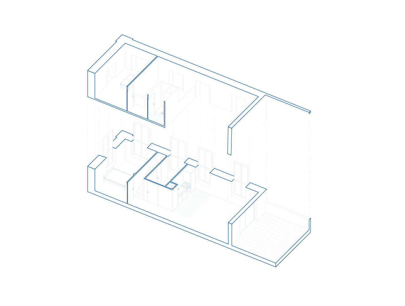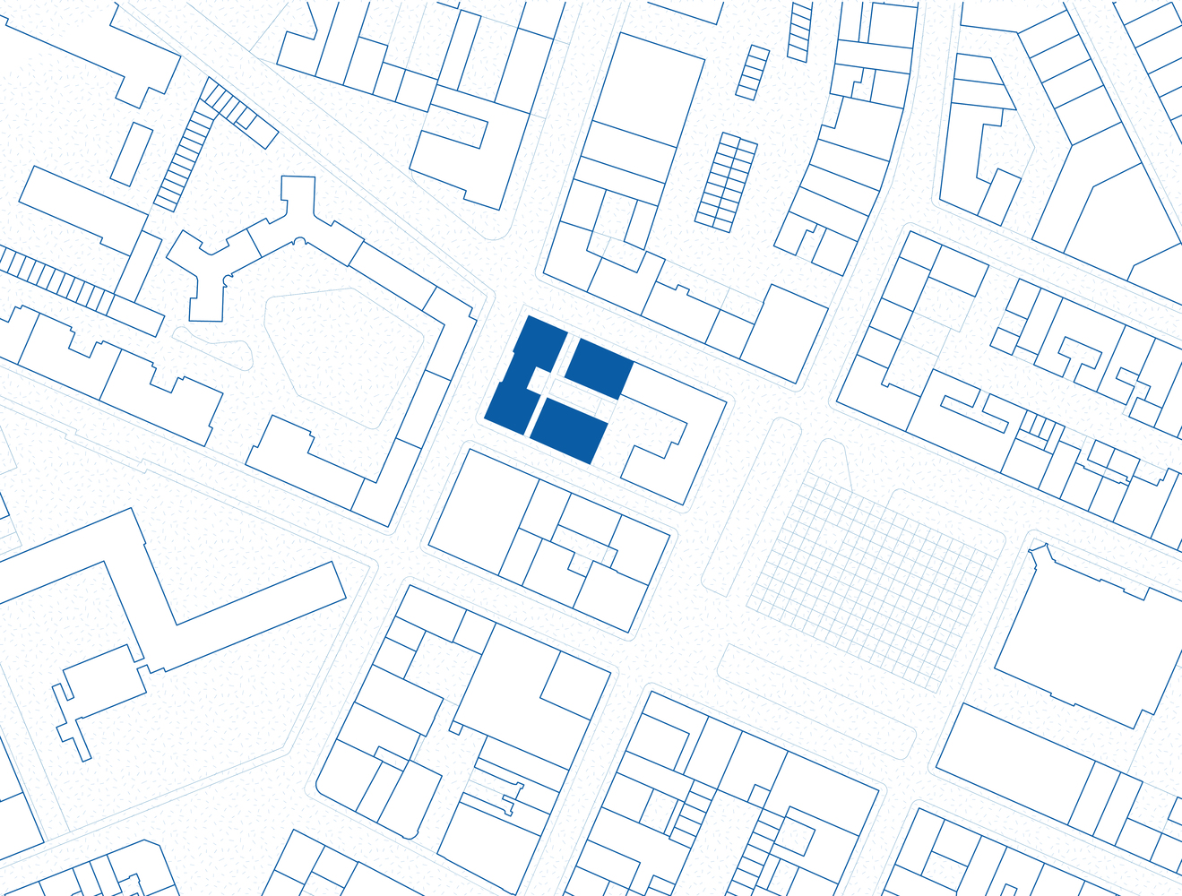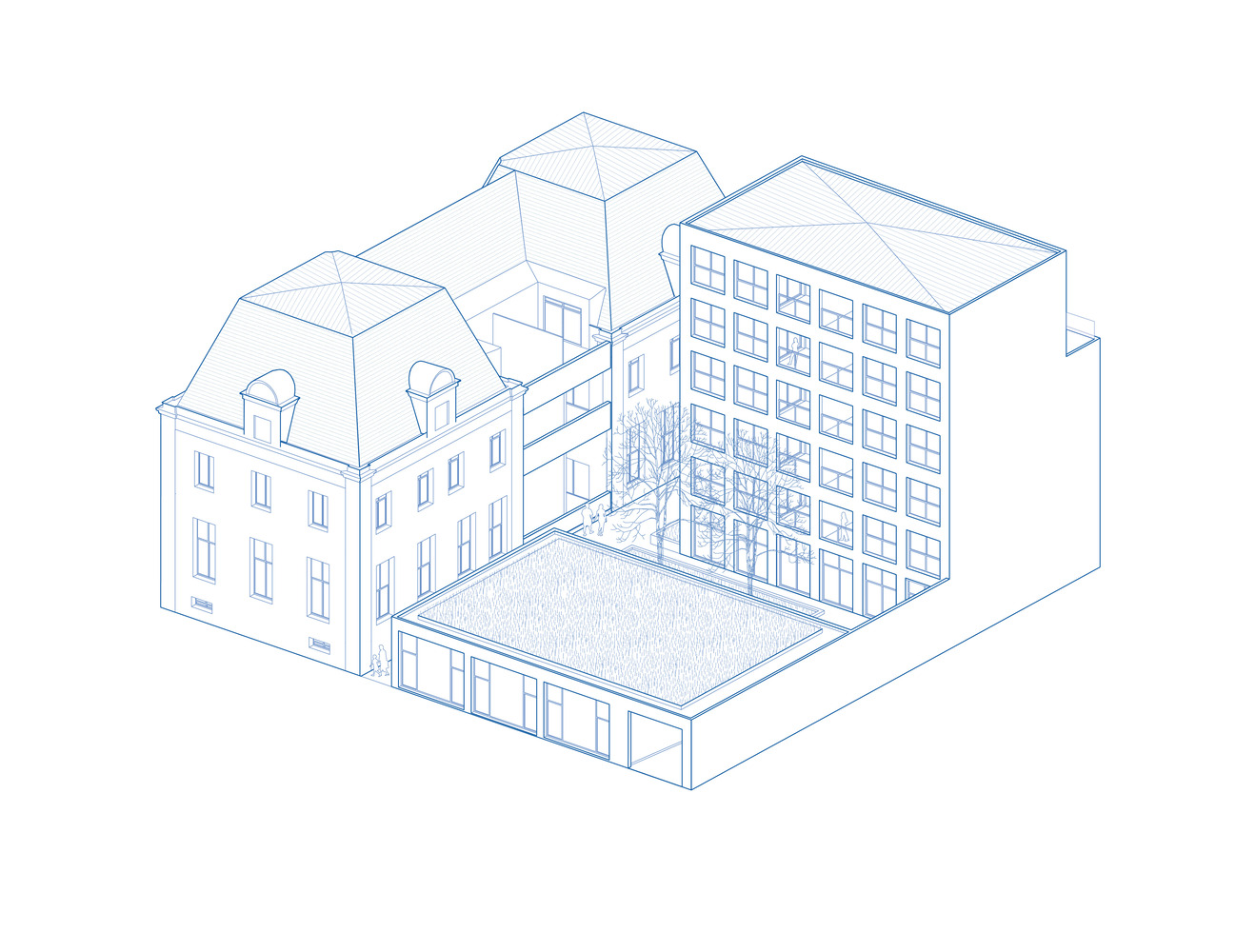 The massing of the new buildings thus clarifies the fragmented existing block to create a coherent urban ensemble and free up a landscaped courtyard at the center.