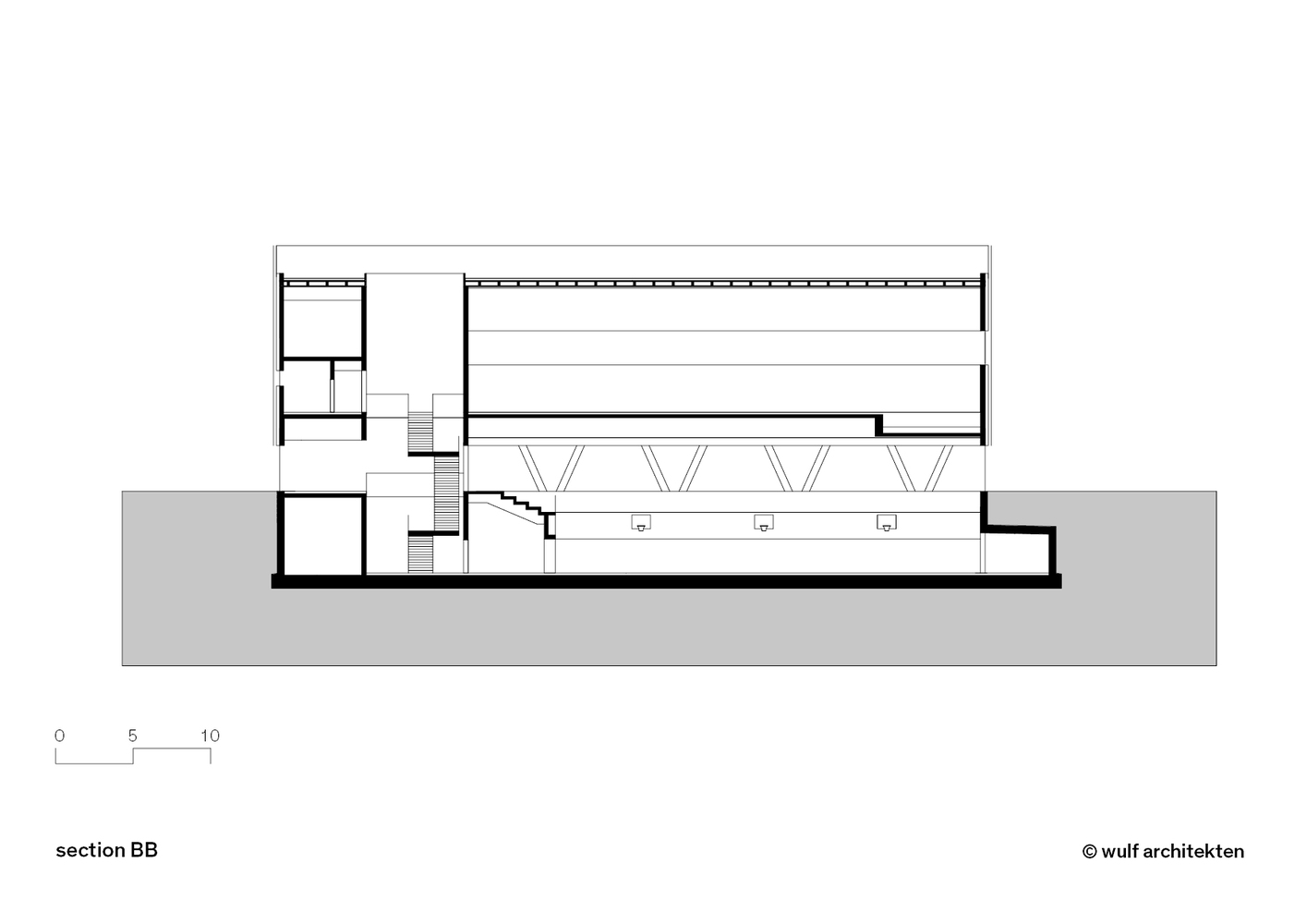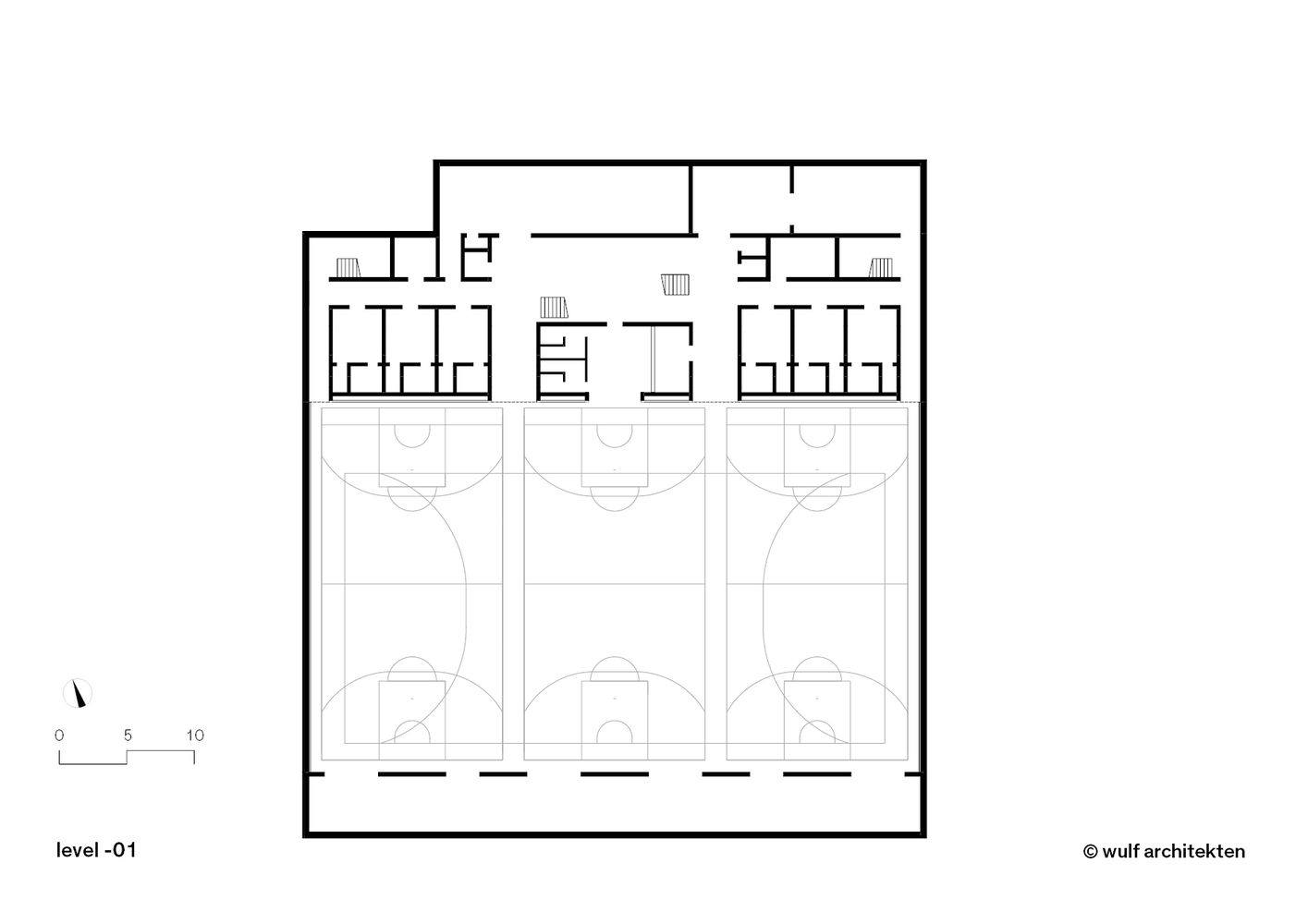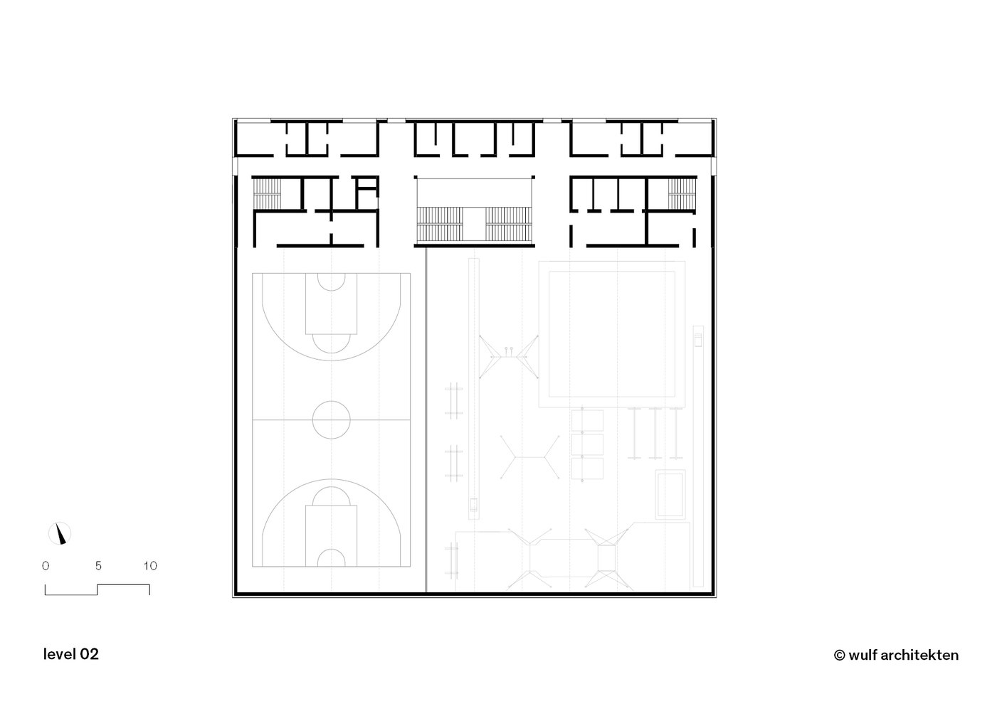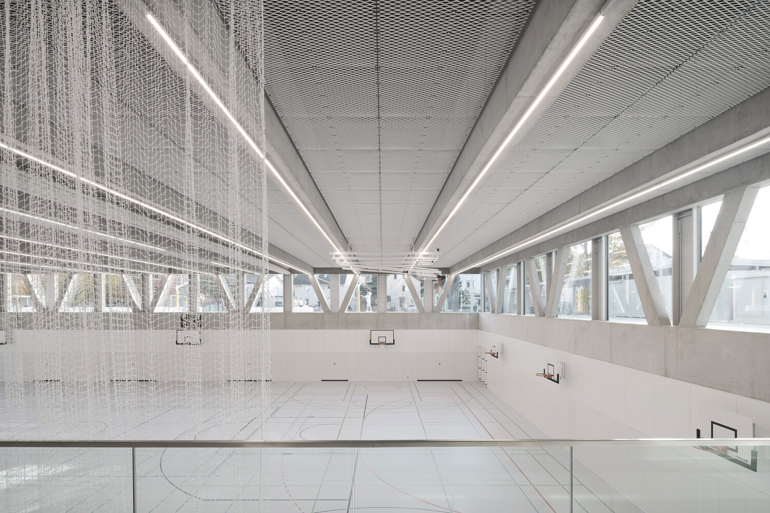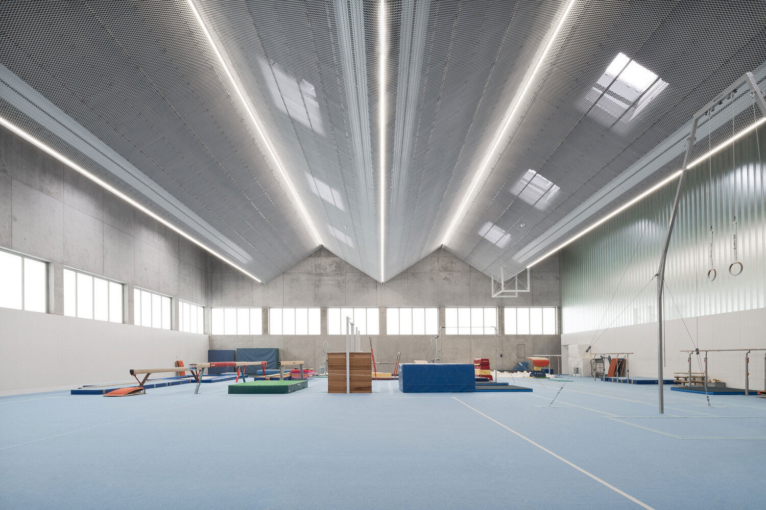 The base of the new building houses the lobby, bleachers, and three-court gymnasium, while the upper floor accommodates the halls for ball sports and gymnastics along with ancillary spaces.