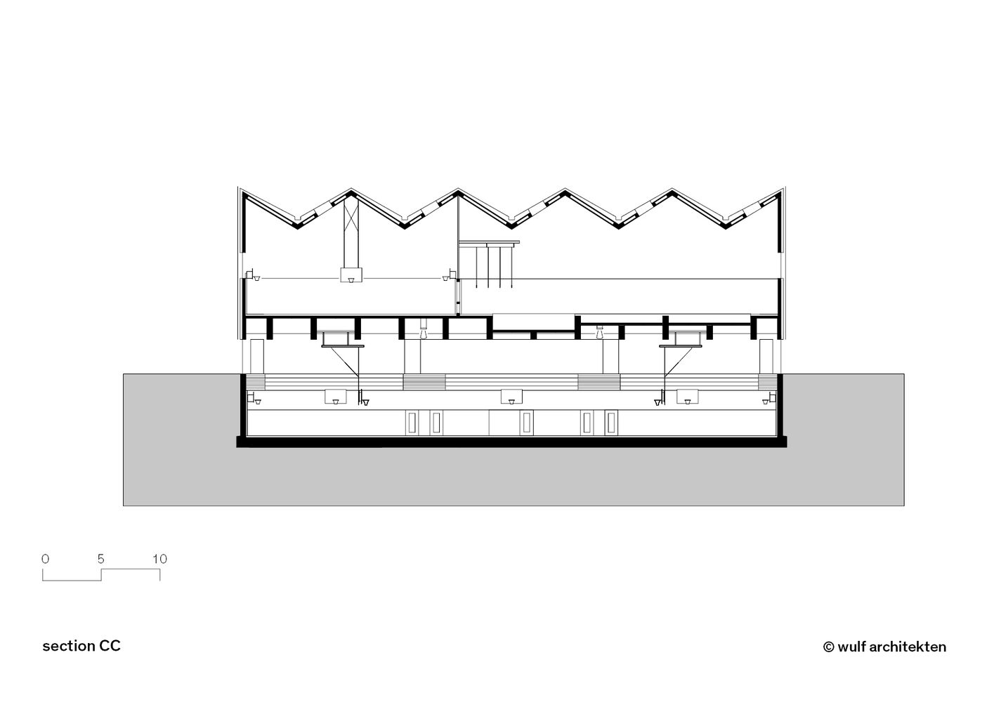 The distinctive folded roof gives structure to the built form and establishes ties to the neighboring, smaller-scale residential buildings.