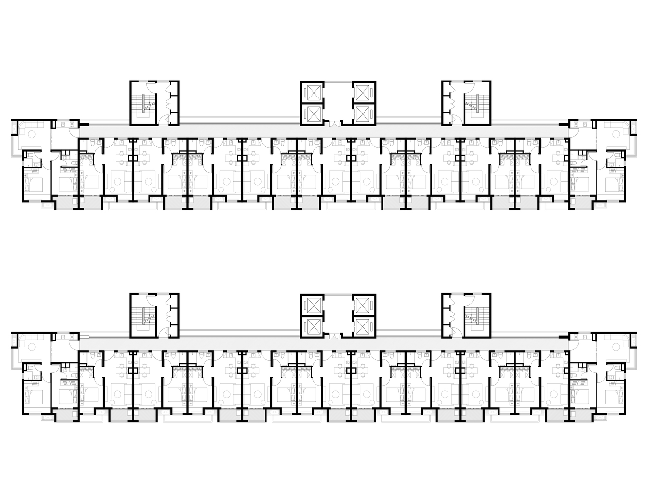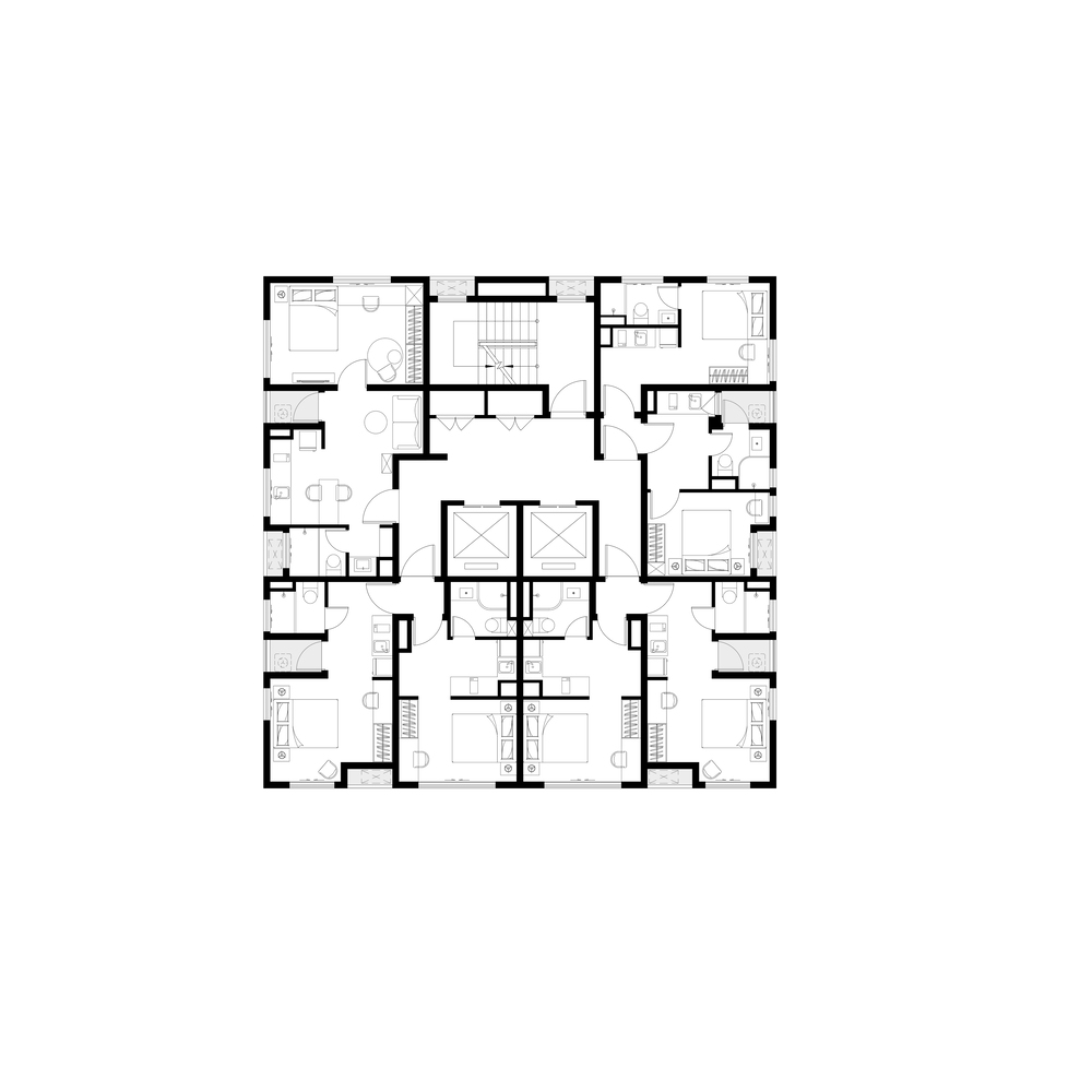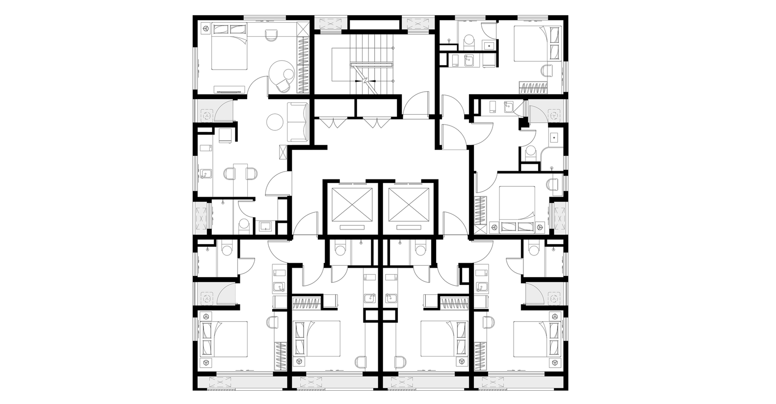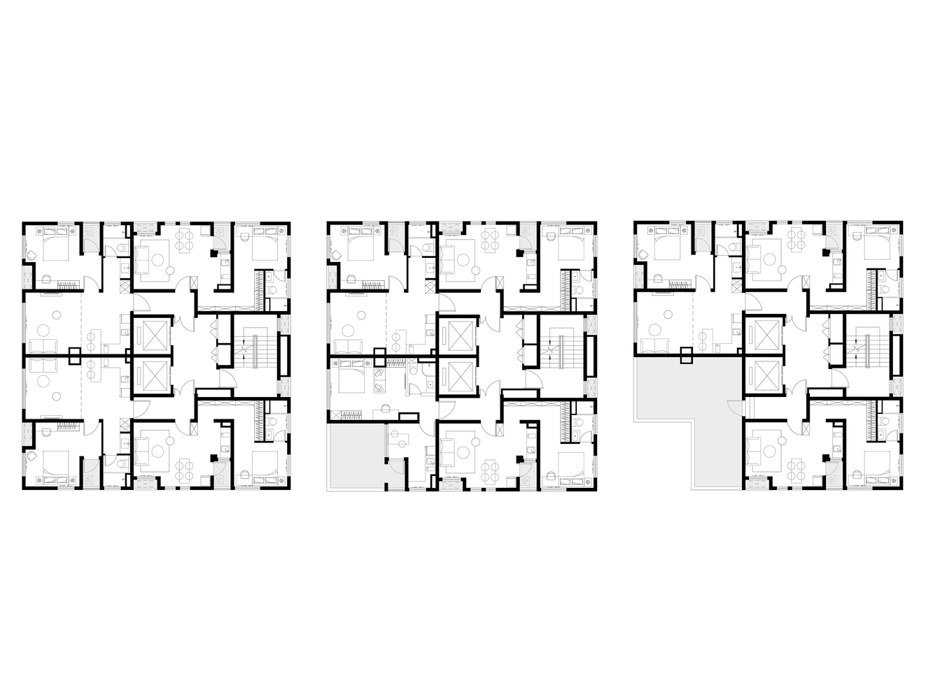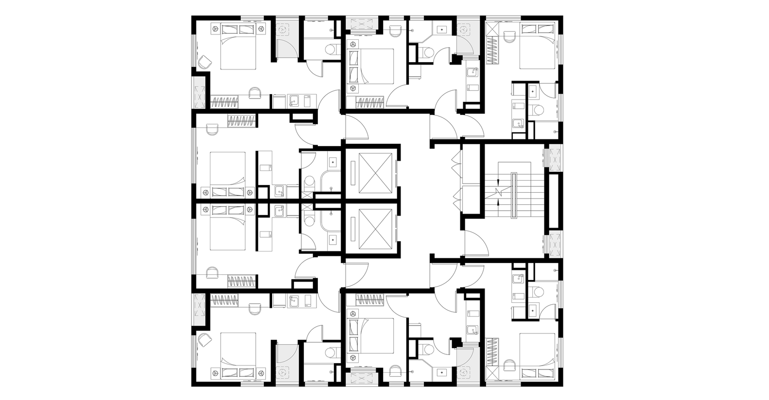 Diversity. Unit sizes span 25 m² to 100 m², inviting varied age groups and household structures. Programmes mutate with policy and market feedback: one entire Small-Block Tower is operated as dormitory-style housing for frontline municipal workers. The four-cluster plan gives this heterogeneous population the spatial heterogeneity it needs.