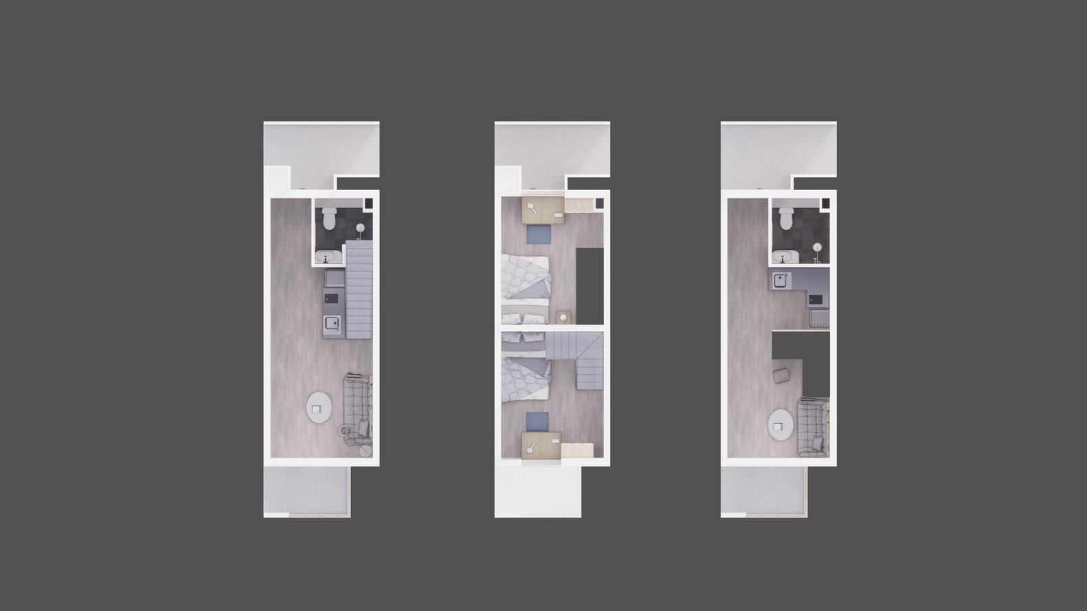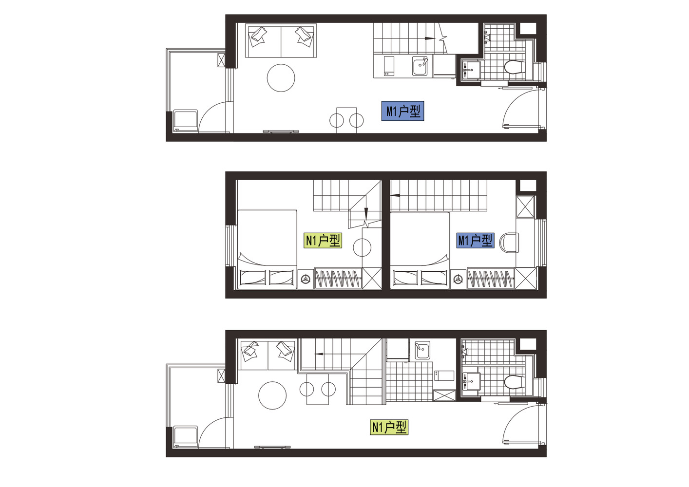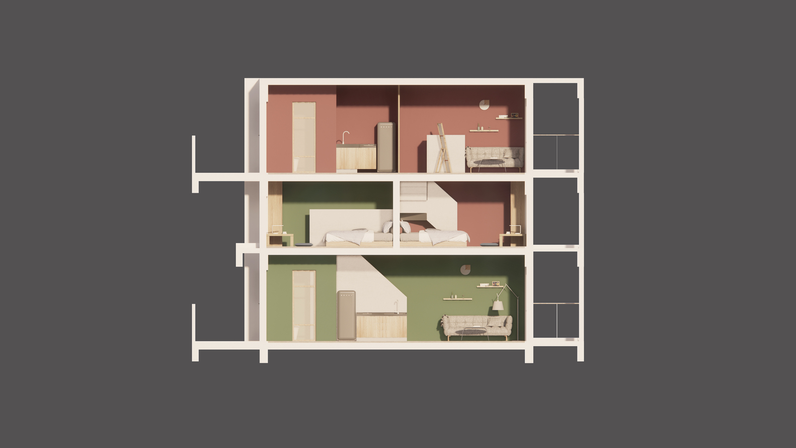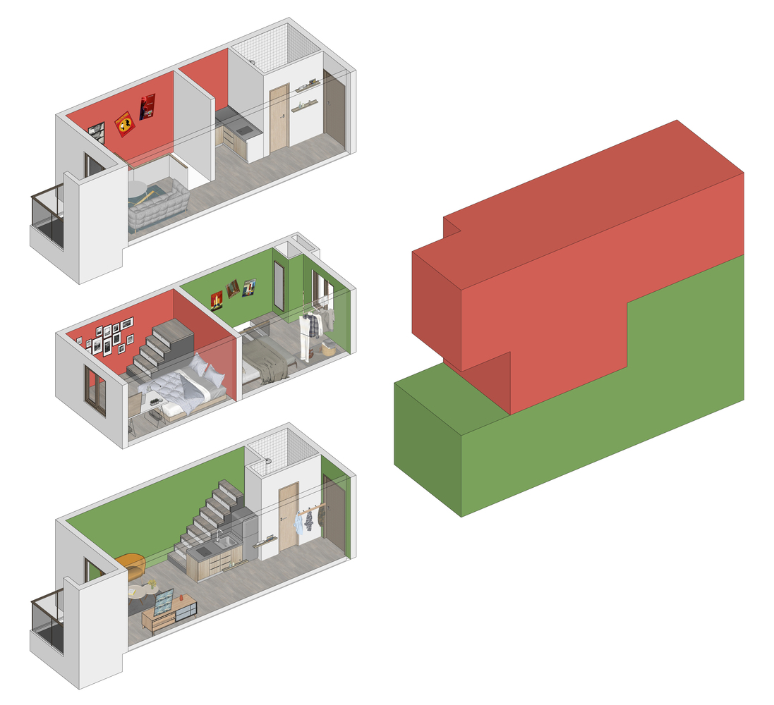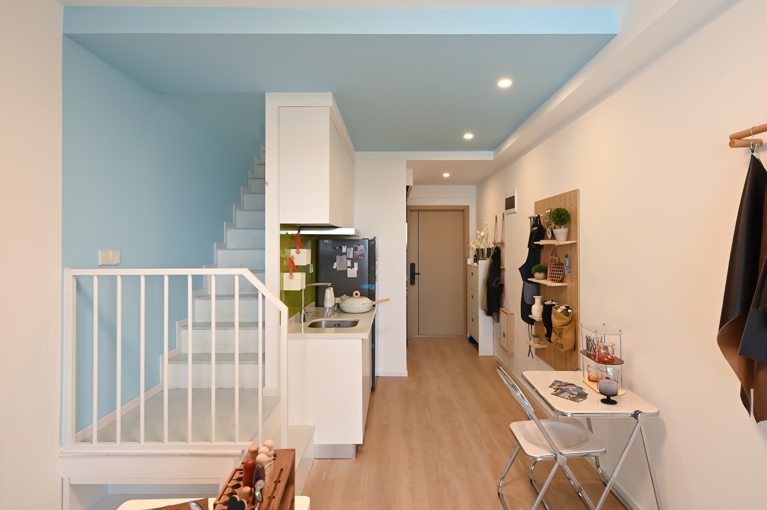 Loft. Born from post-occupancy reflections on Building 5 of Longnan Jiayuan and from full-scale mock-up sessions with the client during the Xuhui Binjiang project, the new duplex fits 2.18 m bedroom height—an unprecedented move that unlocks mezzanine space inside a micro-footprint. The design exploits rental tenants' higher tolerance for "making do", affirming the right to be frugal.