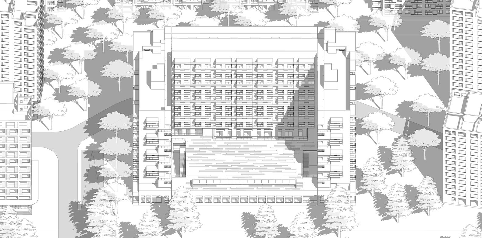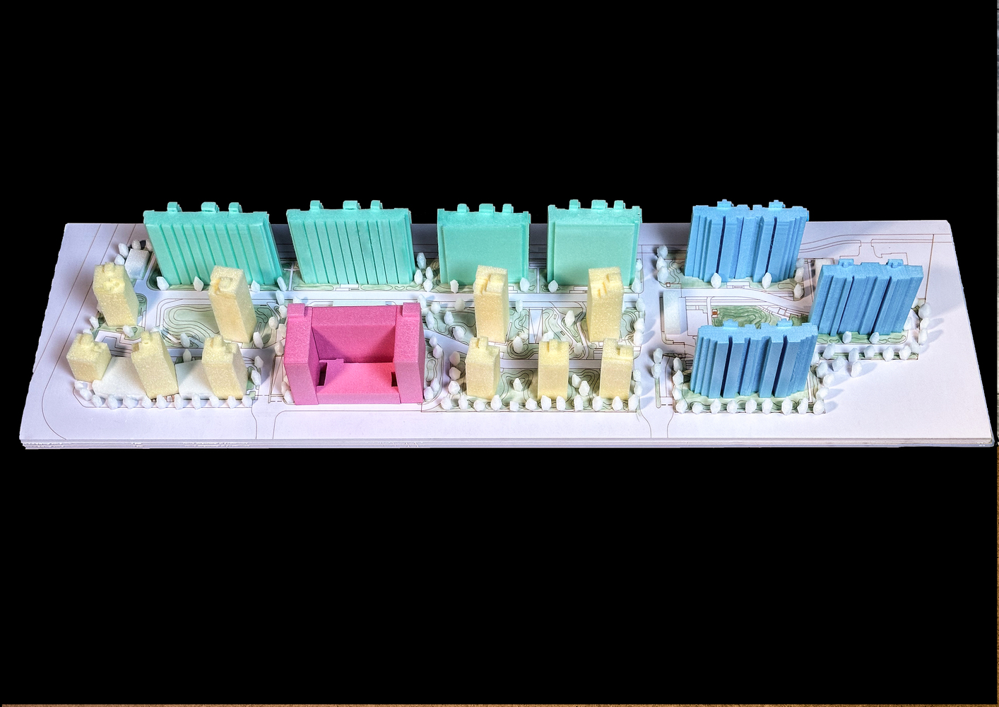 Block. The long east-west site exposes the weakness of the default slab typology. Cutting it into four blocks is the most literal reading of the terrain: it dissolves the intimidating street-wall length and generates distinct sub-types and spatial combinations.